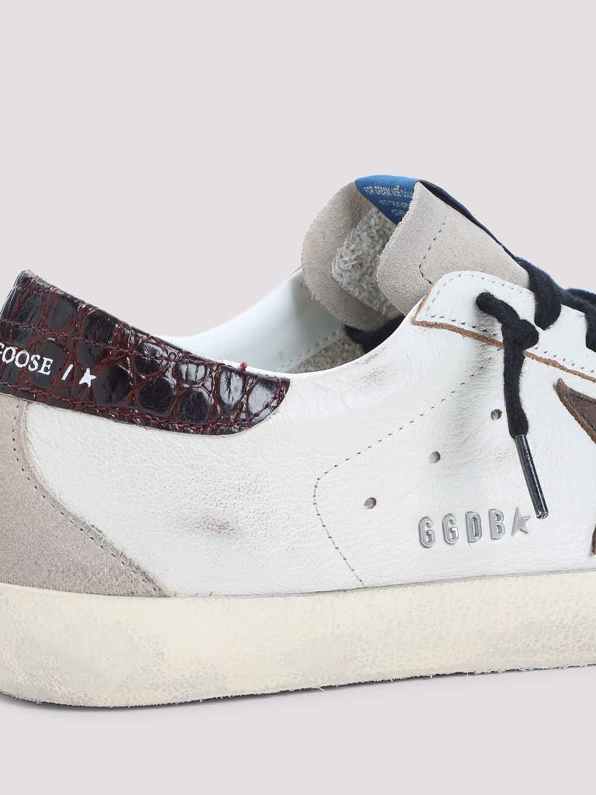 Baskets superstar en cuir de chèvre blanc d'oie doré. Confectionnées en cuir de chèvre et cuir de vachette mélangés. Bout rond, fermeture à lacets noire contrastante sur le dessus, logo bleu sur la languette, détail en étoile emblématique marron sur le côté, logo en lettres métalliques argentées sur le côté, détails perforés sur la partie supérieure, détail marron au dos avec logo en lettres blanches contrastées, détails gris sur la partie supérieure, semelle beige.