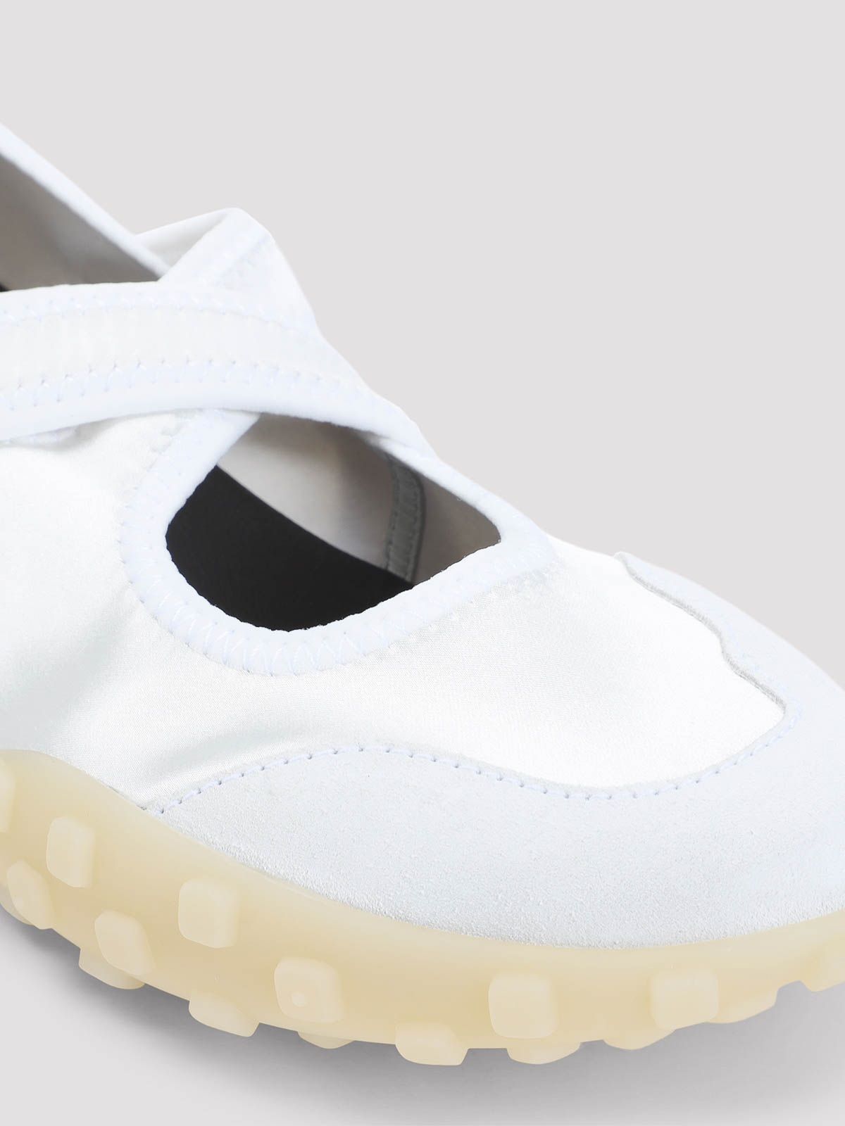 Ballerines Jil Sander Moon en polyamide blanc. Confectionnées en satin blanc et cuir suédé, elles sont dotées d'un bout rond, de deux bretelles croisées sur le dessus, d'une languette dans le dos, d'une semelle intérieure en cuir et d'une semelle extérieure en galet en caoutchouc.