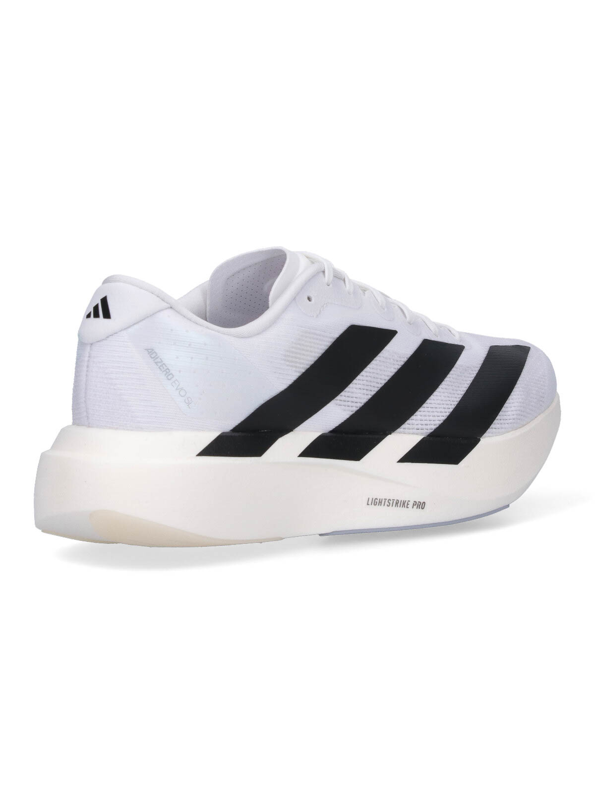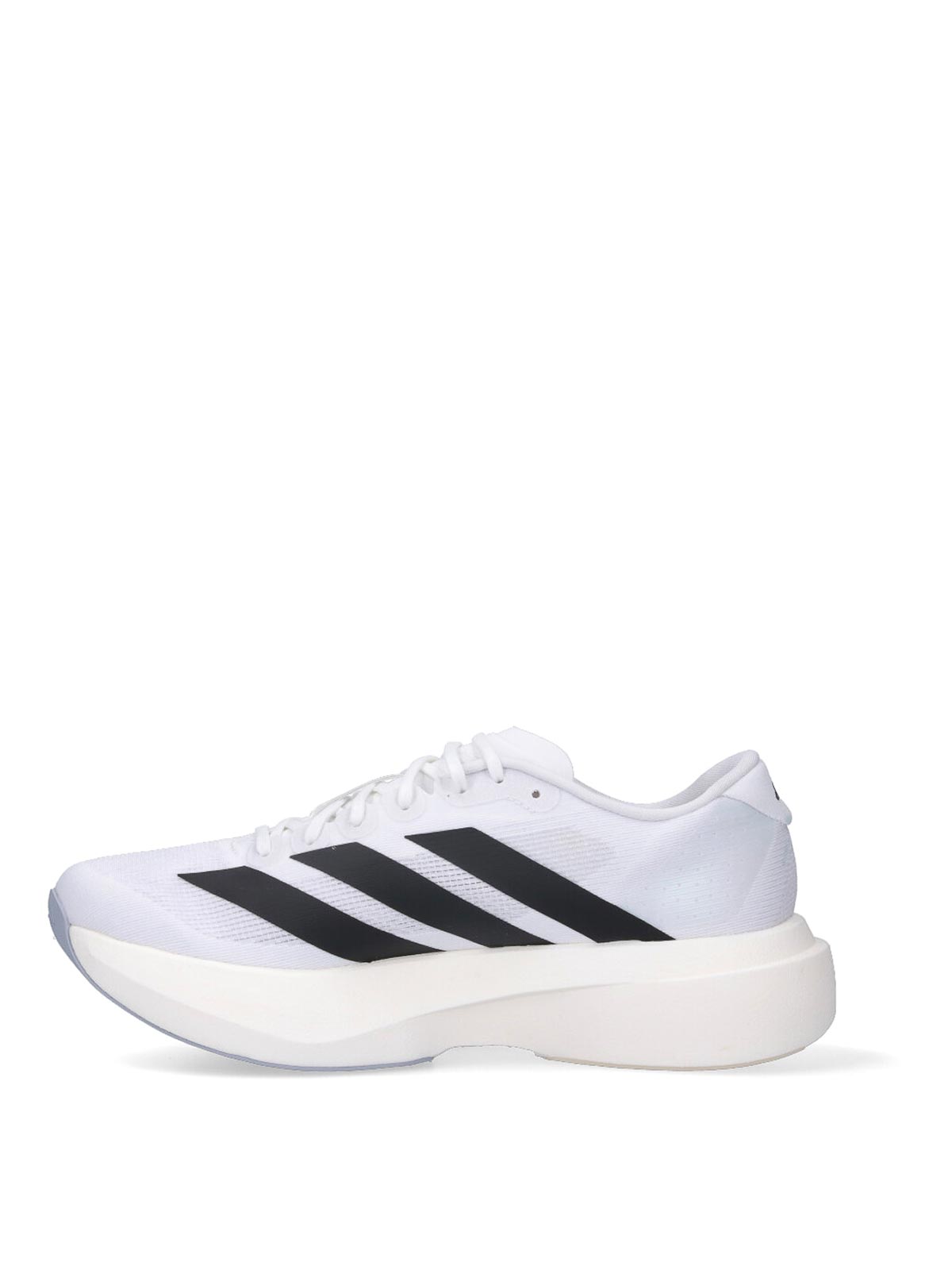 Baskets Adizero Evo SL Adidas, en tissu blanc, bout rond, fermeture à lacets, détail de l'étiquette du logo, bandes contrastées latérales emblématiques, logo contrastant sur la languette rétro, semelle en caoutchouc.
