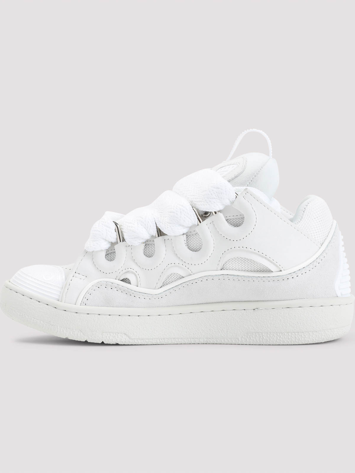 Baskets Lanvin en cuir de veau blanc Curb. Baskets inspirées des années 90, l'empeigne multicouche est confectionnée en cuir de veau noir et en maille avec des empiècements en cuir suédé et en caoutchouc ton sur ton. Elles sont dotées d'un bout en amande, d'une fermeture à double lacet tissé, d'une languette rembourrée avec plaque griffée, d'une doublure et d'une semelle intérieure en textile de marque et d'une semelle extérieure en caoutchouc blanc.