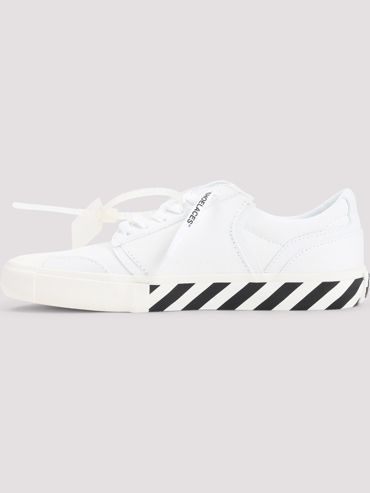 Baskets blanches et noires à entaille vulque, blanches et noires, à bout rond blanc, ornées de lacets griffés, d'une étiquette nominative en haut et d'un logo en forme de flèche sur le côté, en textile et en tissu rayé.