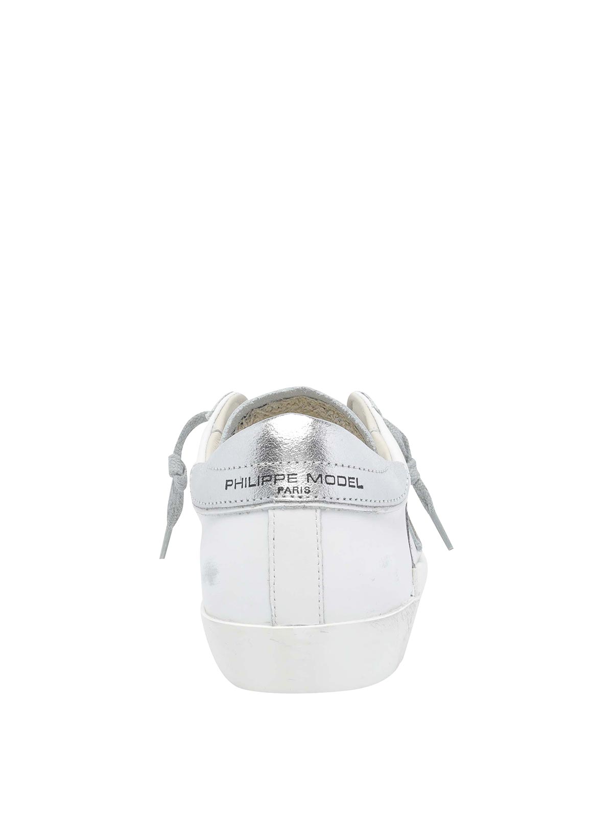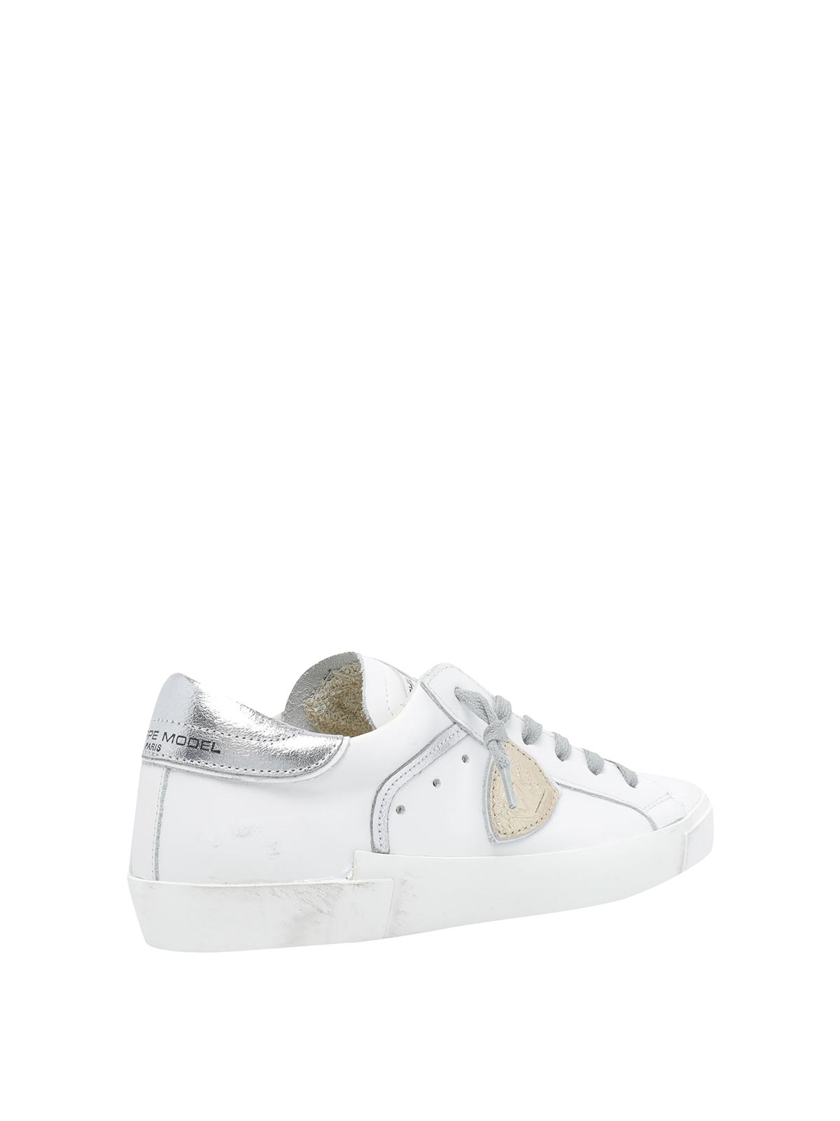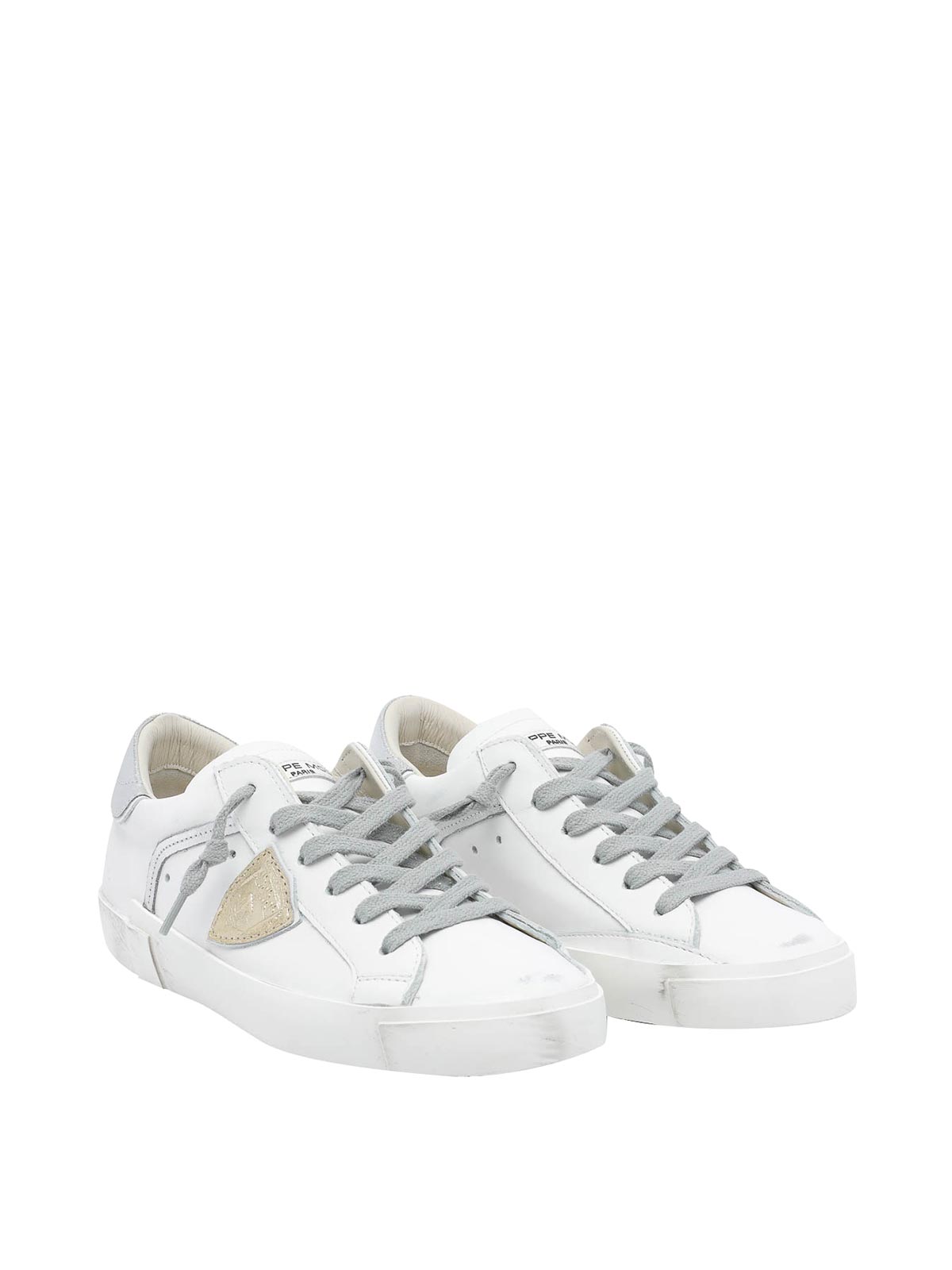 Sneakers Prsx blanches modèle Philippe, bout rond, logo latéral, dessus en cuir, fermeture à lacets