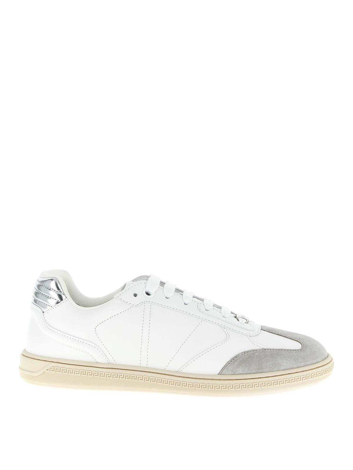 baskets en cuir lisse Greca Court avec empiècements en daim, écusson logo sur la languette, fermeture à lacets, semelle en caoutchouc.