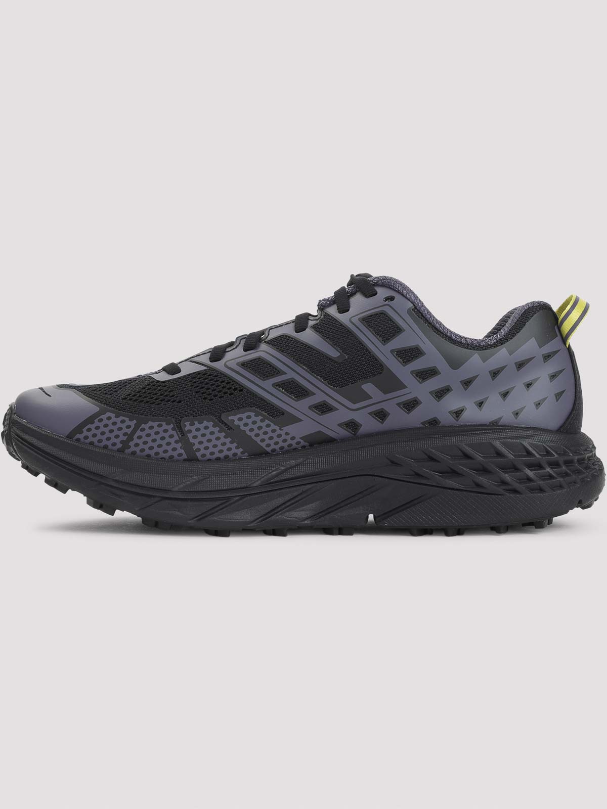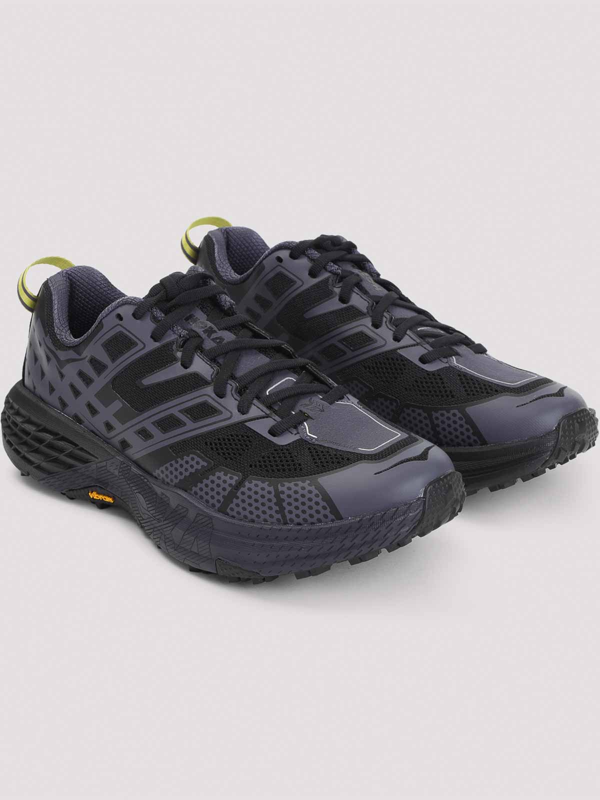 Sneakers Hoka Black Squid Ink Textile U Speedgoat Sneakers en pur textile à bout rond, haut à lacets, logo sur la languette gris encre de seiche au dos, bracelet jaune contrastant noir avec logo embossé orange contrastant sur le côté