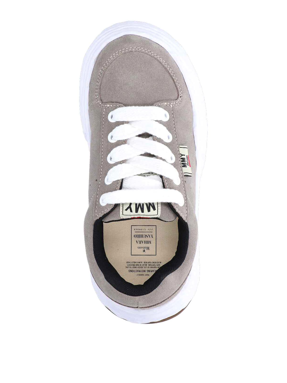 Baskets basses Oliver de la Maison Mihara Yasuhiro, en cuir de veau gris, fermeture à lacets, bout rond, étiquette logo sur le devant et sur les côtés, semelle en caoutchouc contrastante.