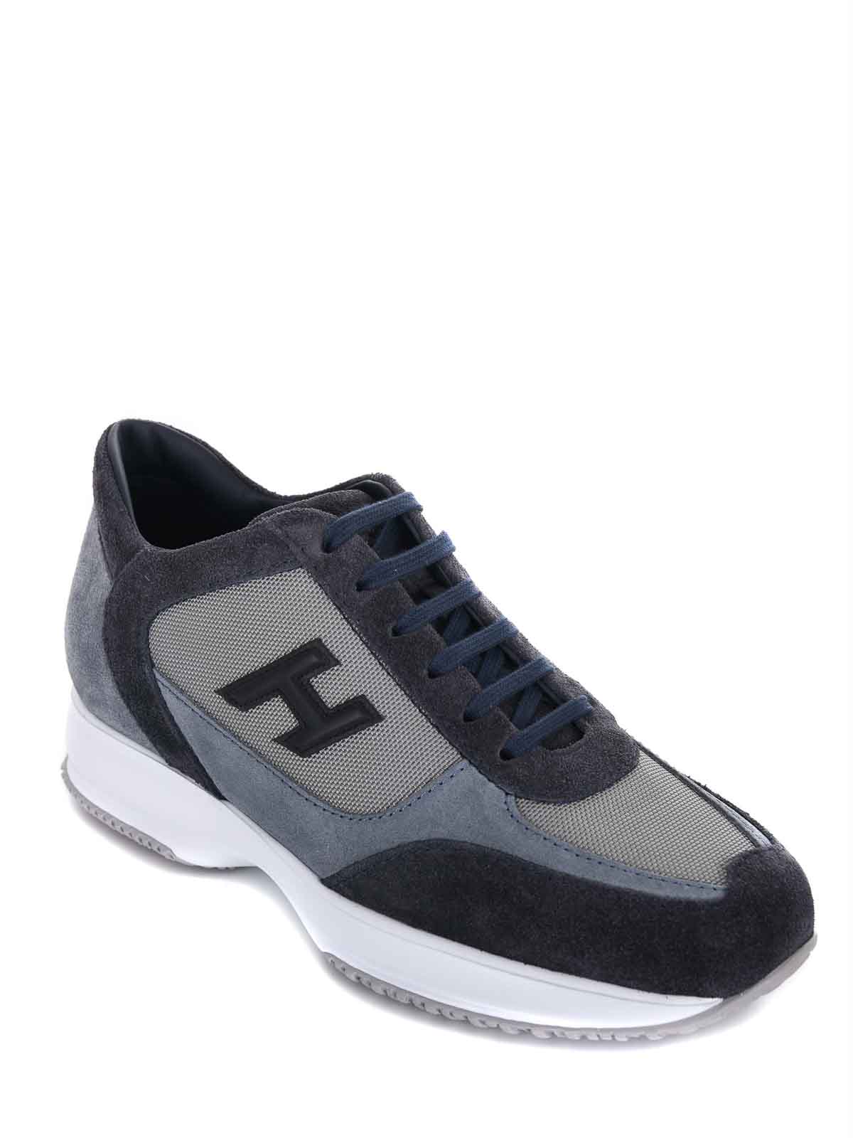 Baskets Hogan en daim et nylon bleu/avion. empiècements en cuir. Lacets. Logo sur la languette. Logo H en cuir. semelle en caoutchouc avec lettrage Hogan ton sur ton au dos.