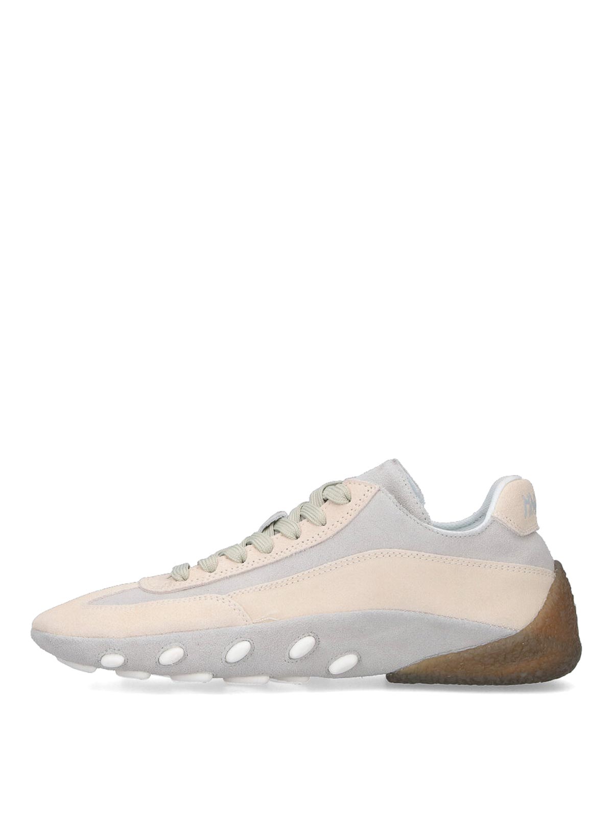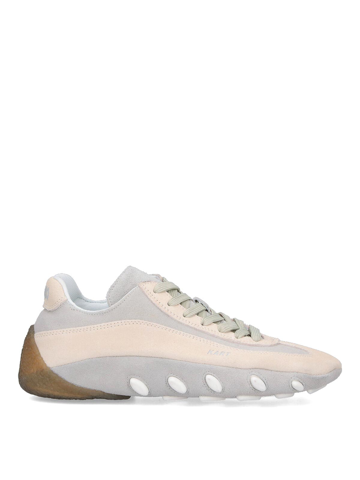 Baskets de kart Magliano, en daim gris et beige, bout rond, fermeture à lacets, logo sur la languette arrière, détail de la semelle arrière marron, semelle en caoutchouc.