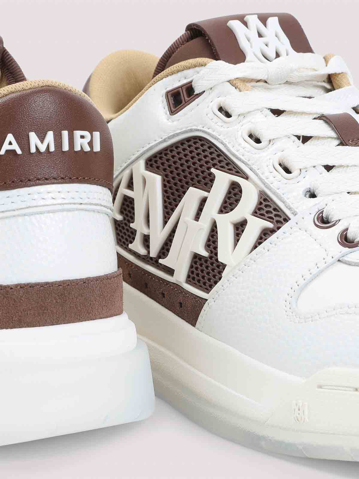 Baskets basses classiques en cuir de vachette marron à galets Amiri. Confectionnées en cuir de vachette blanc et marron, dotées d'un bout rond, de détails perforés sur le dessus, d'une fermeture à lacets, d'un logo 3D sur la languette et sur le côté, d'un logo estampé au dos, d'une doublure en maille, d'une semelle intérieure en textile et d'une semelle extérieure en caoutchouc transparent.