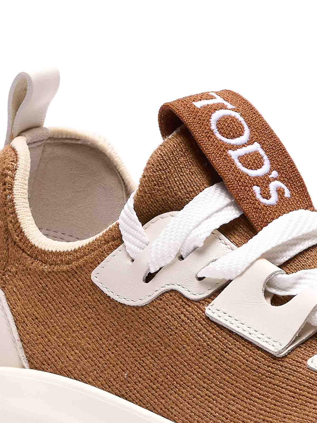 Baskets Tod's en tissu et cuir marron, bout rond, fermeture à lacets, dessus en cuir et tissu