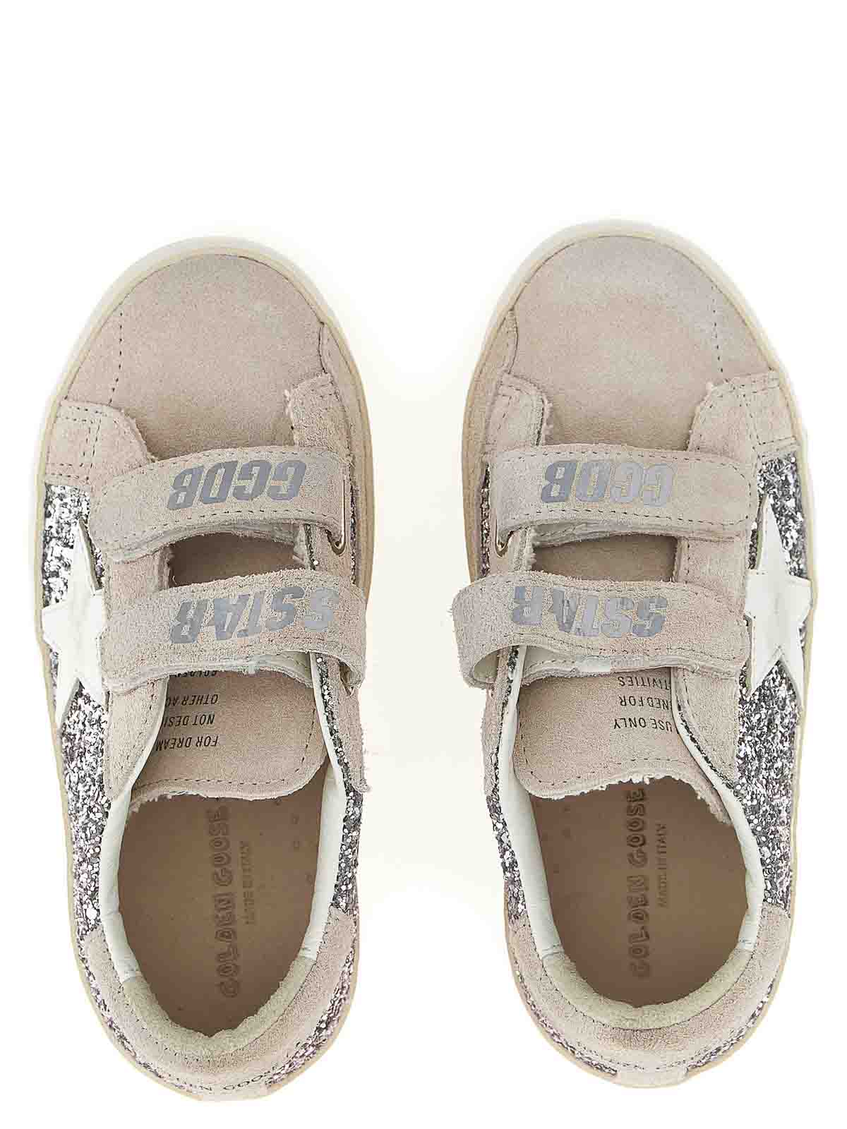 Baskets « old school » en daim et paillettes pour enfants, étoile latérale contrastante, fermeture à bande velcro et logo imprimé, semelle en caoutchouc avec traitement effet vintage.