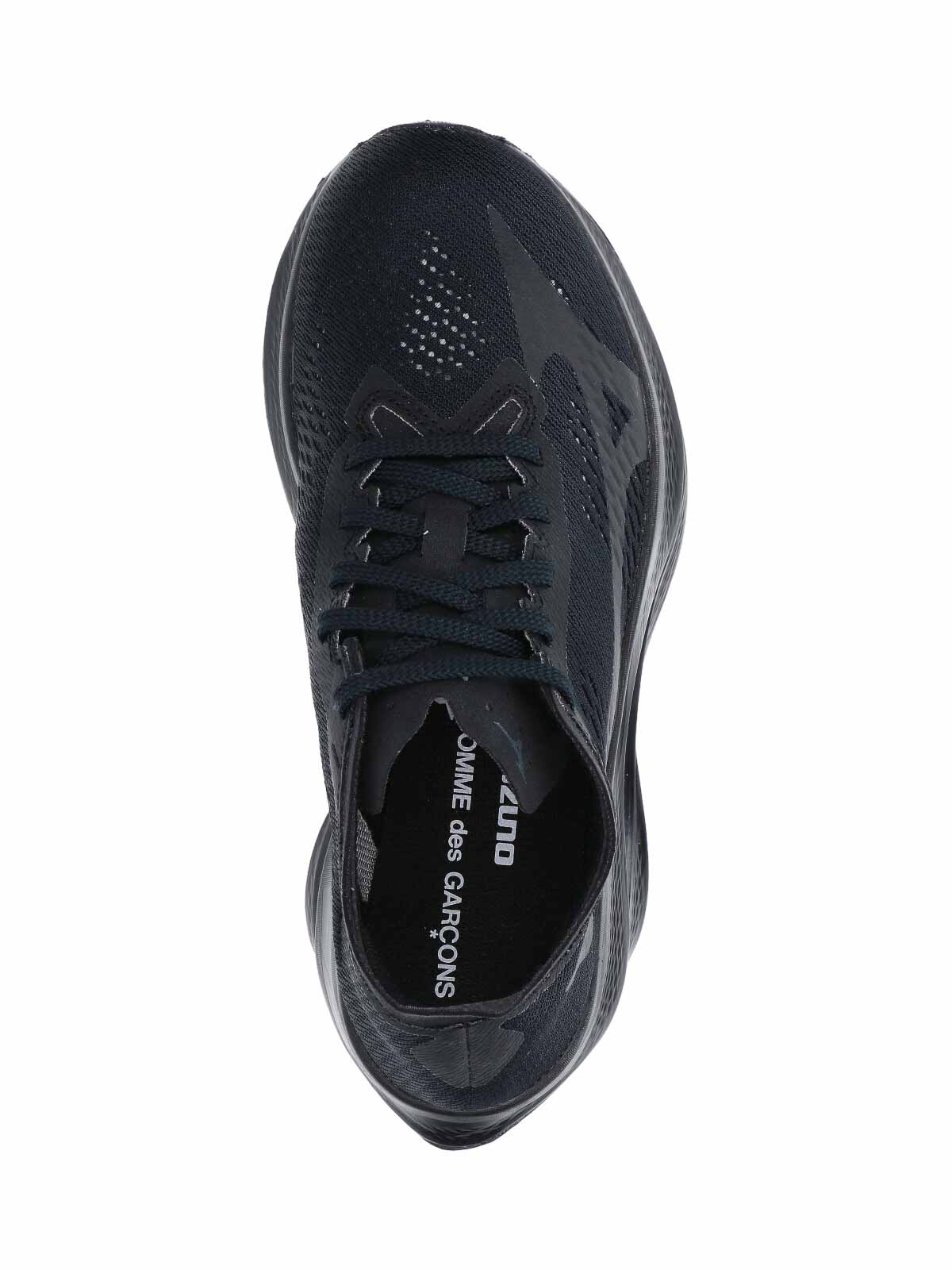 Baskets Comme des Garçons X Mizuno Wave Rebellion Pro, en tissu noir, bout rond, fermeture à lacets, détails ton sur ton, semelle en caoutchouc G3.