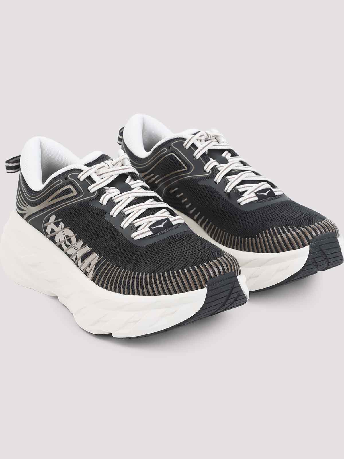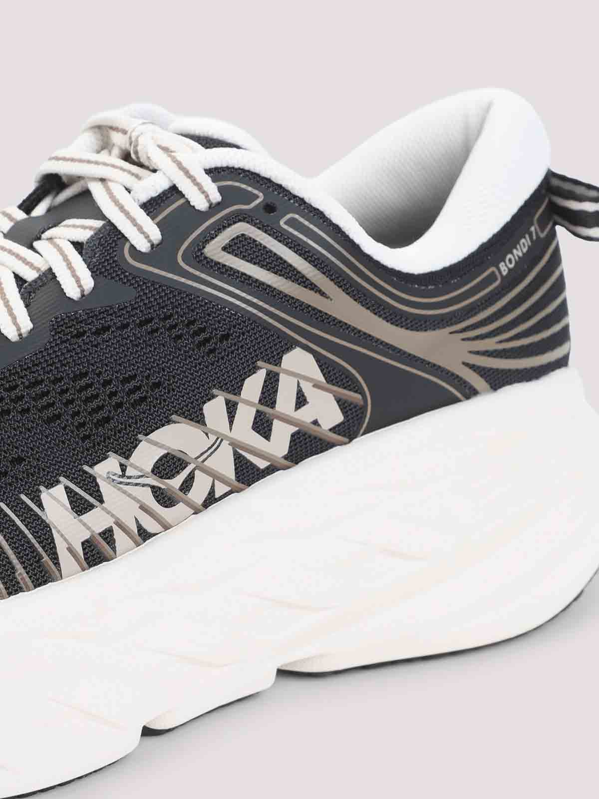Sneakers Hoka en textile noir W Bondi 7. Baskets en textile noires, bout rond, fermeture à lacets rose et blanche, logo en lettres roses sur le côté, rayures roses et détails sur la partie supérieure, semelle en caoutchouc blanc.