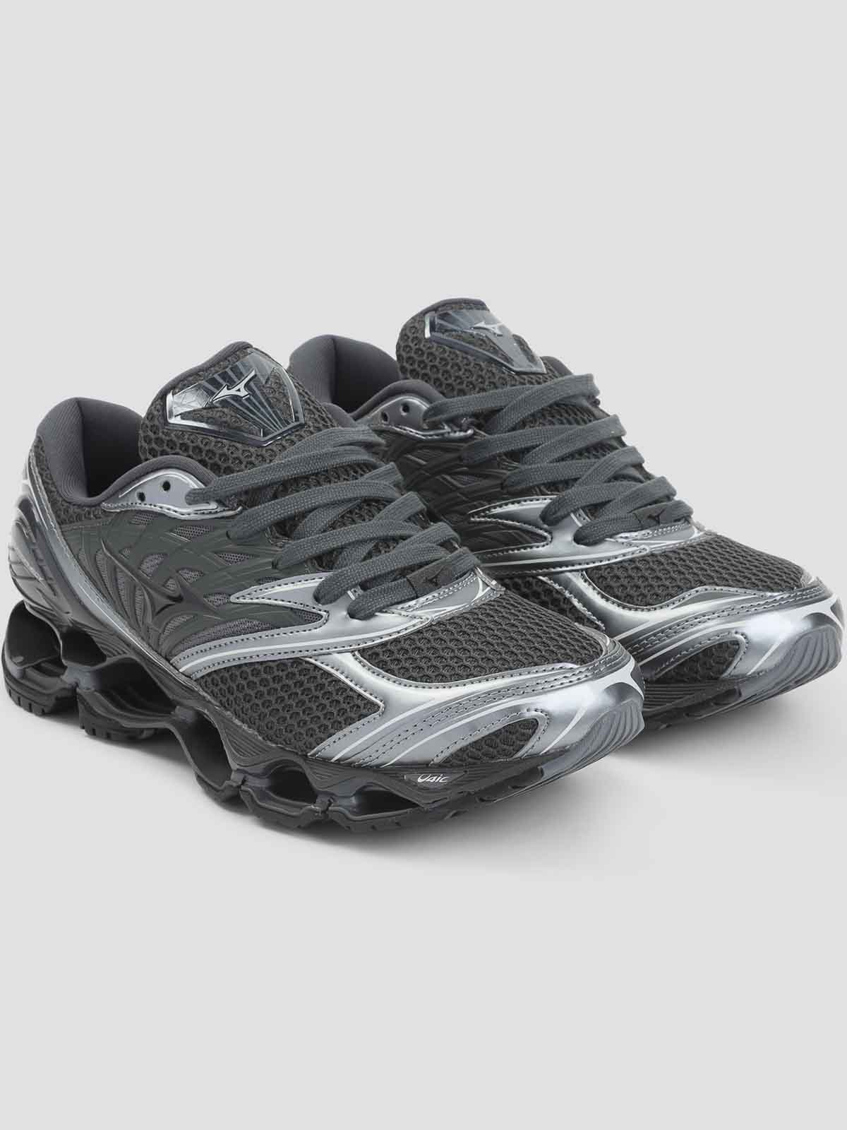 Baskets de sport Mizuno Wave Prophecy LS en cuir gris. Confectionnées en cuir, fermeture à lacets sur le dessus, logo appliqué sur la languette, logo noir sur le côté, détails en cuir gris argenté métallisé sur la partie supérieure, détails en maille gris foncé sur la partie supérieure, motif cage latérale, logo en lettres blanches contrastantes. Semelle en caoutchouc gris avec détails découpés.