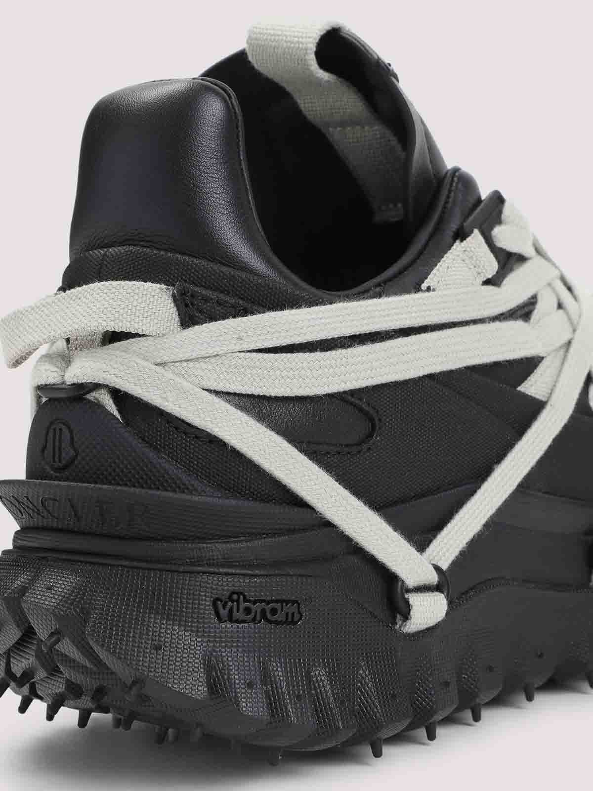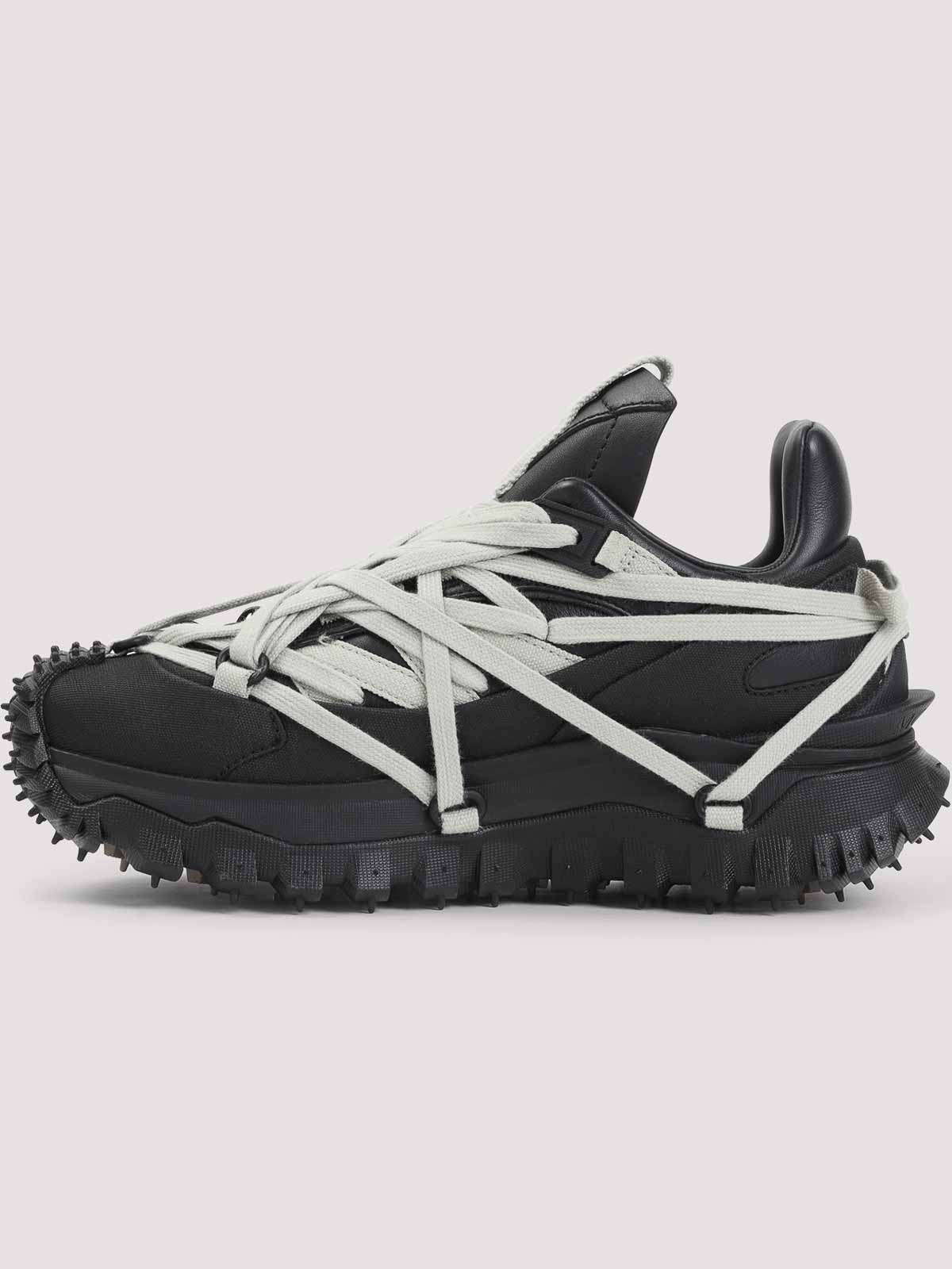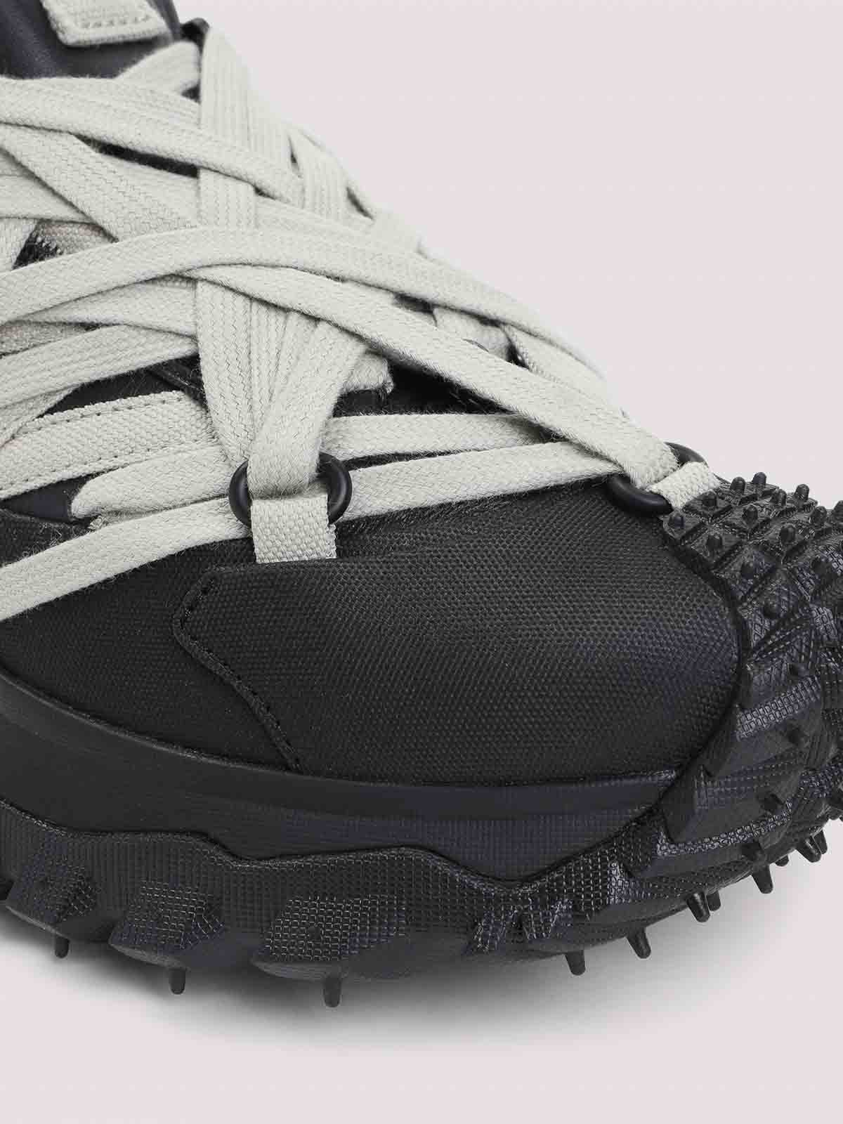 Mégalace Trailgrip noire Moncler x Rick Owens. Baskets en cuir noires à hauteur de cheville avec doublure en maille. dossier rembourré qui s'élève en pointe, panneaux incurvés superposés et languette biseautée ornée de sangles. Détail emblématique en forme de pentagramme sur le devant. Spoiler en TPU, semelle intermédiaire en EVA, pour plus de flexibilité et de légèreté, avec une bande de roulement spéciale en caoutchouc Vibram Megagrip, avec adhérence dentée pour plus de traction et de durabilité, semelle intérieure en ortholite. La hauteur de leur semelle est de 4,5 cm.