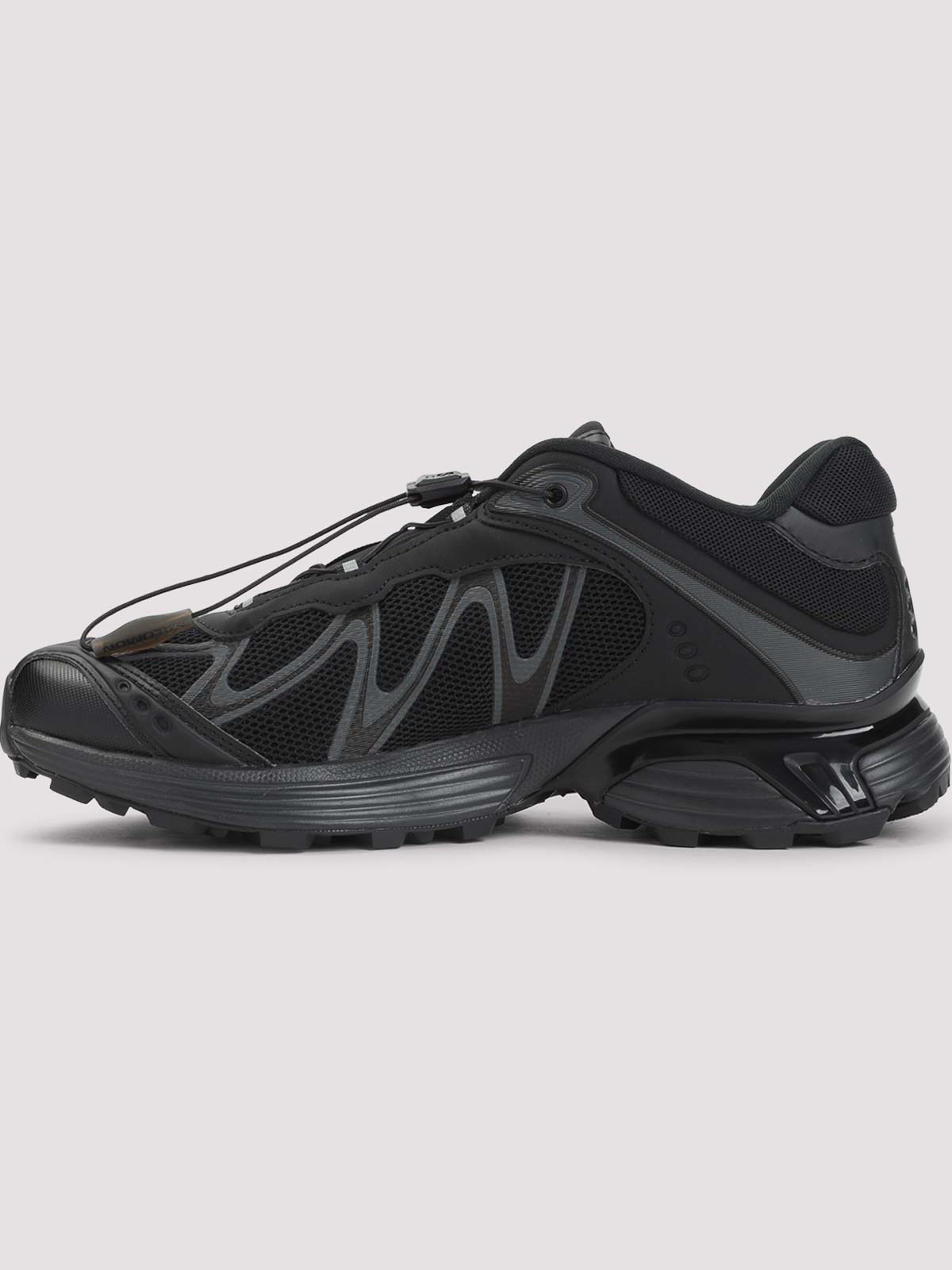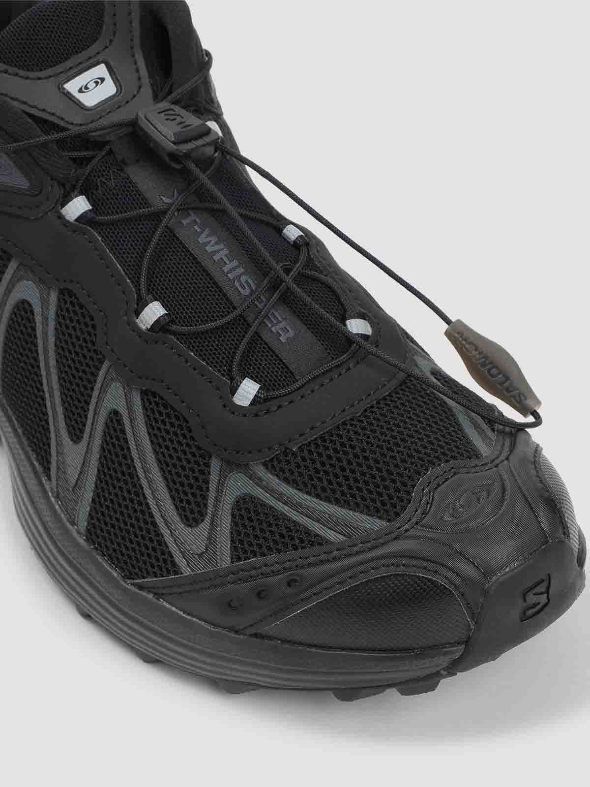 Baskets en textile noir Salomon XT-Whisper. Confectionnées en maille noire avec détails enduits gris et noirs, dotées d'un bout rond, d'une fermeture à cordon, d'un logo sur la languette, d'une signature sur le côté, d'une semelle intérieure en eva, d'une doublure rembourrée et d'une semelle extérieure en caoutchouc pour la course.