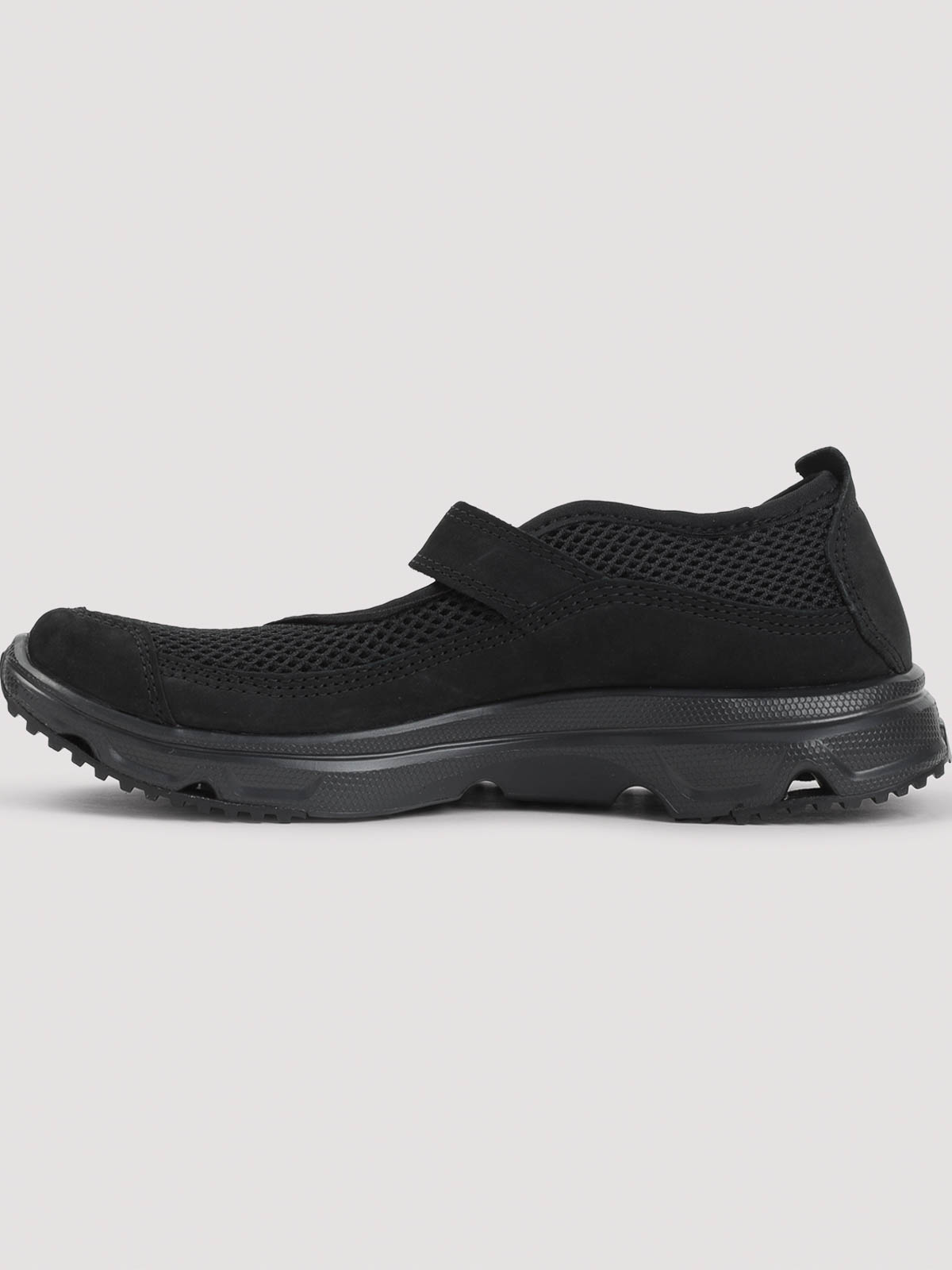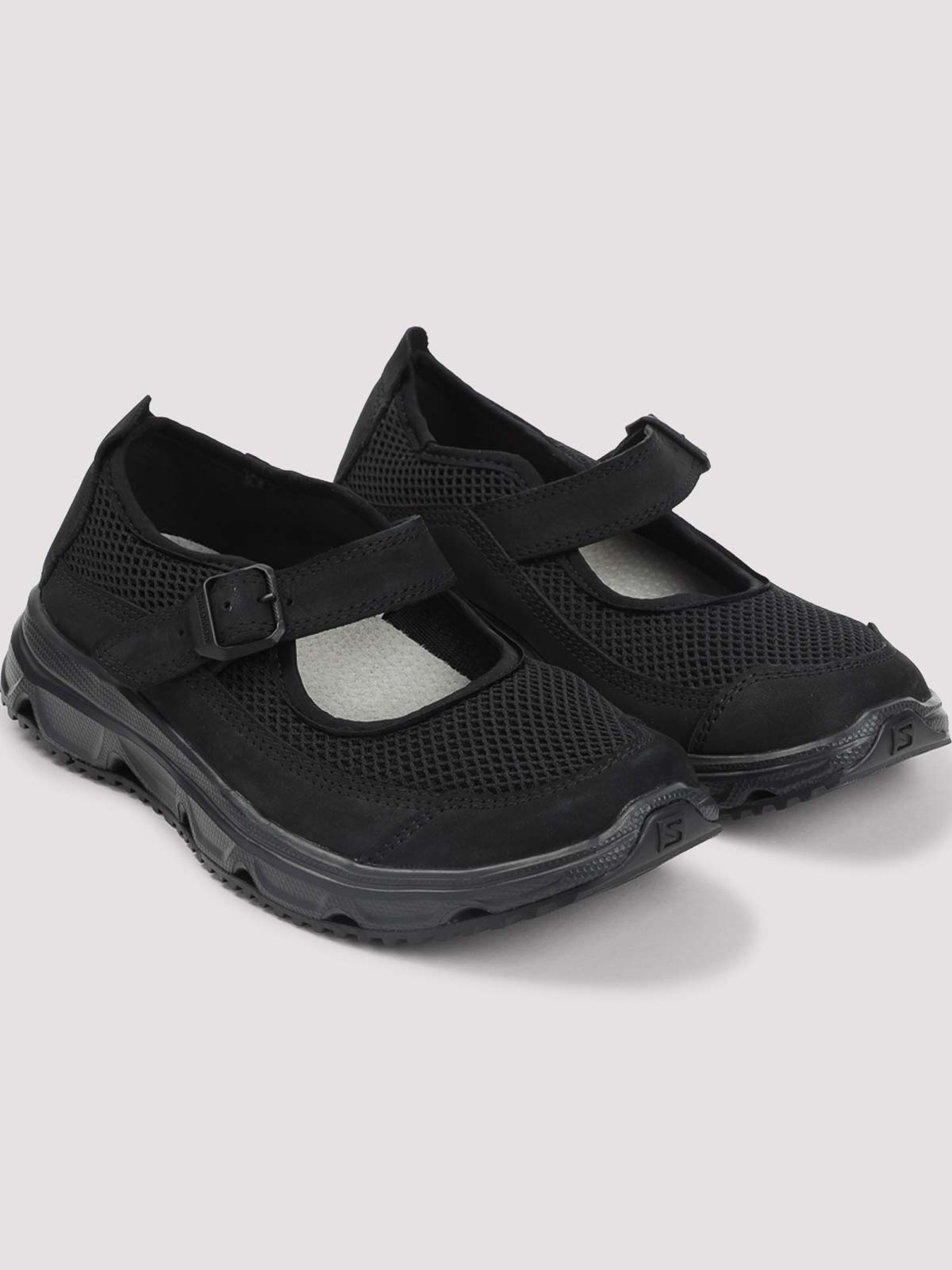 Baskets en cuir noir Salomon RX Marie-Jeanne. Design inspiré de Mary Jane confectionné en maille de cuir noir, avec un bout rond, une sangle ajustable sur le dessus avec boucle, un talon renforcé, une semelle intérieure en textile eva et une semelle extérieure en caoutchouc pour la course.