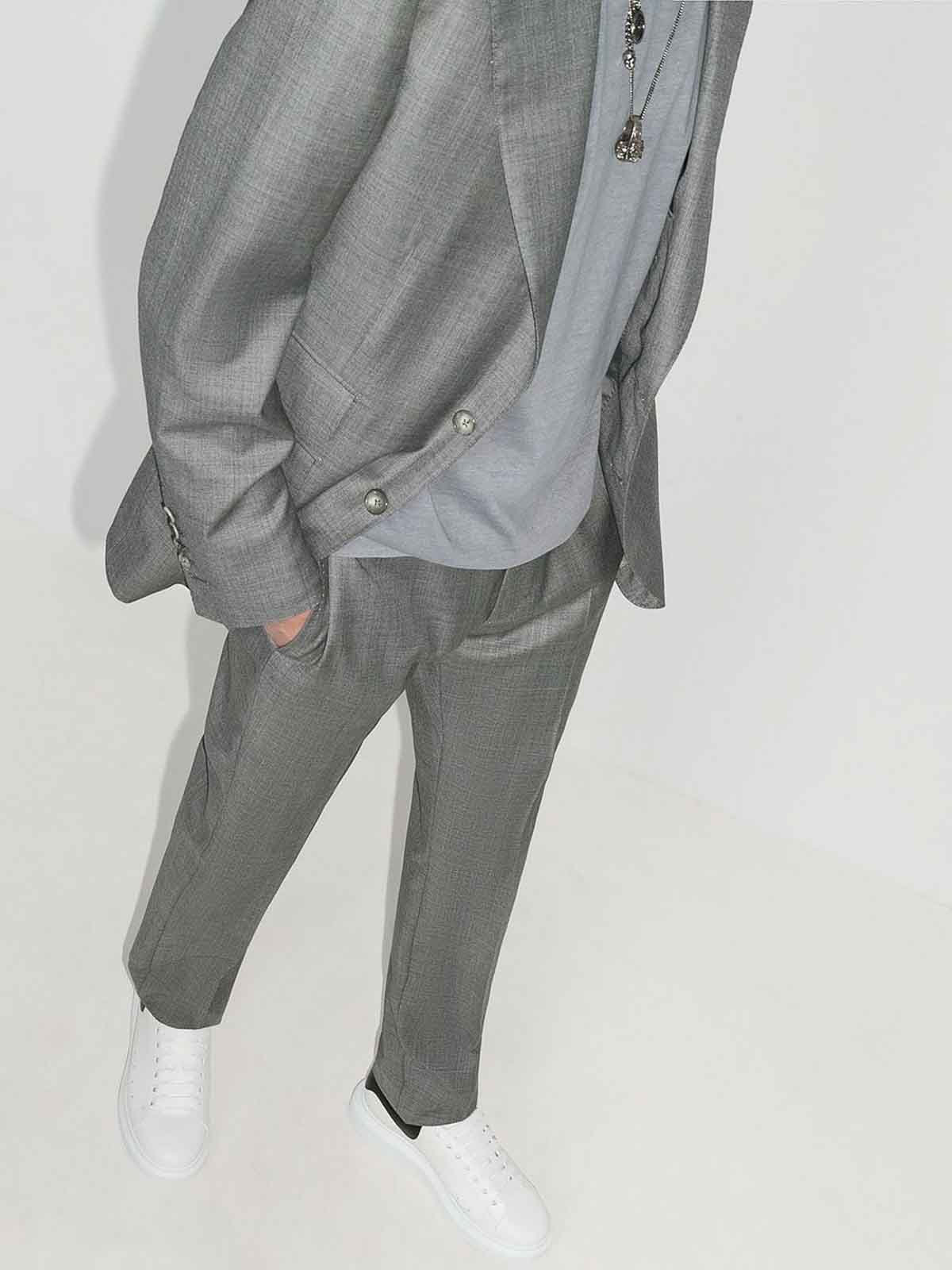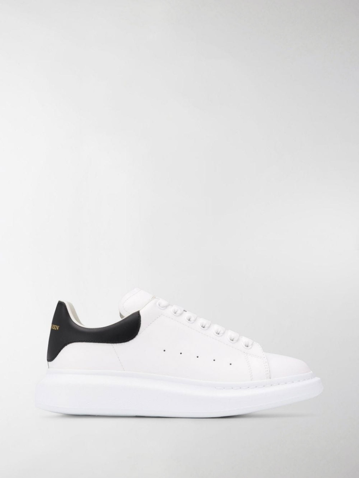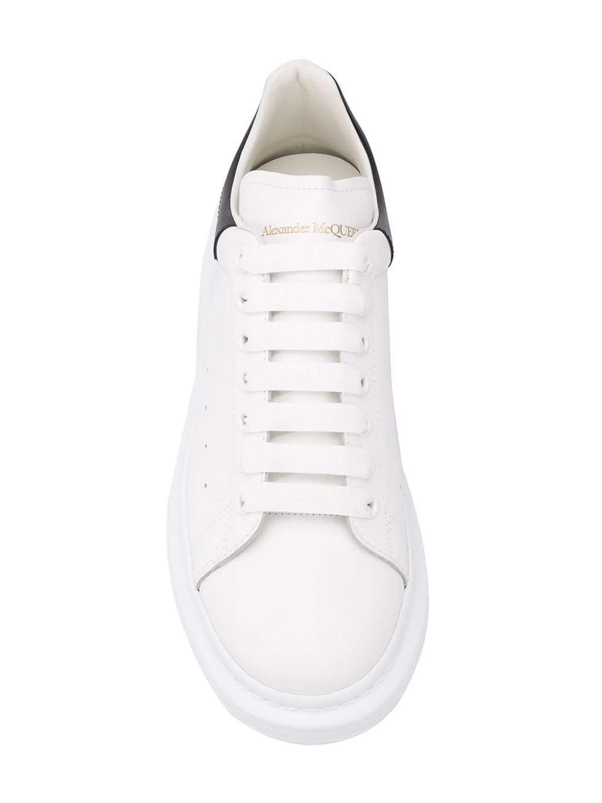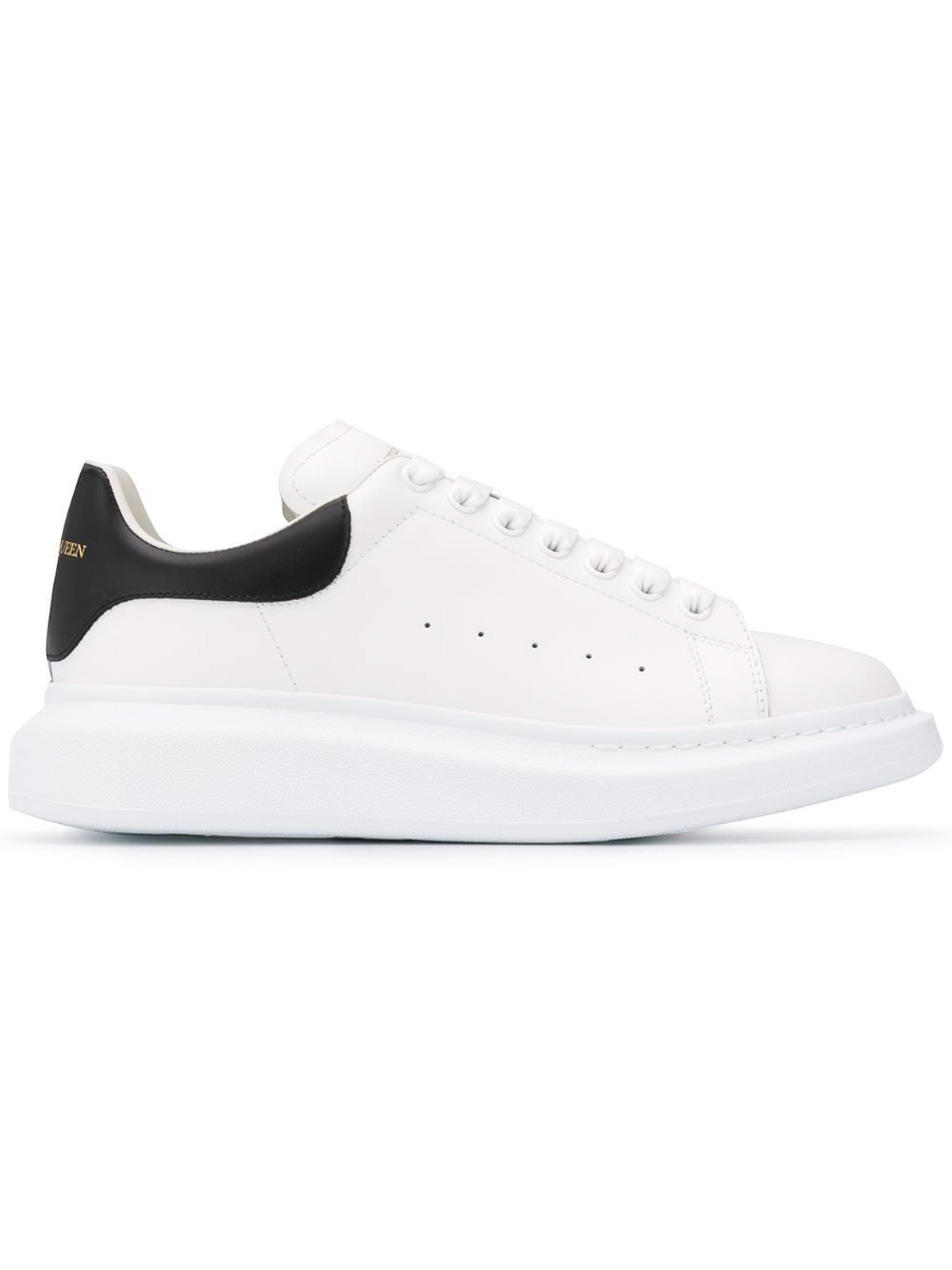 Alexander McQueen, baskets « oversize » en cuir de veau pour homme avec talon contrasté, blanches, cuir de veau, talon noir, bout rond, fermeture à lacets, patch logo sur la languette, semelle plate