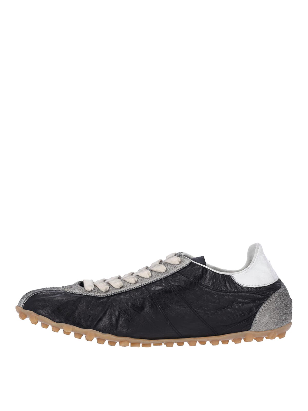 Baskets sprinters Maison Margiela en cuir de chèvre noir, bout rond, fermeture à lacets, étiquette logo numérique sur la languette, finitions en daim contrastantes, surpiqûres au dos, semelle en caoutchouc texturé.