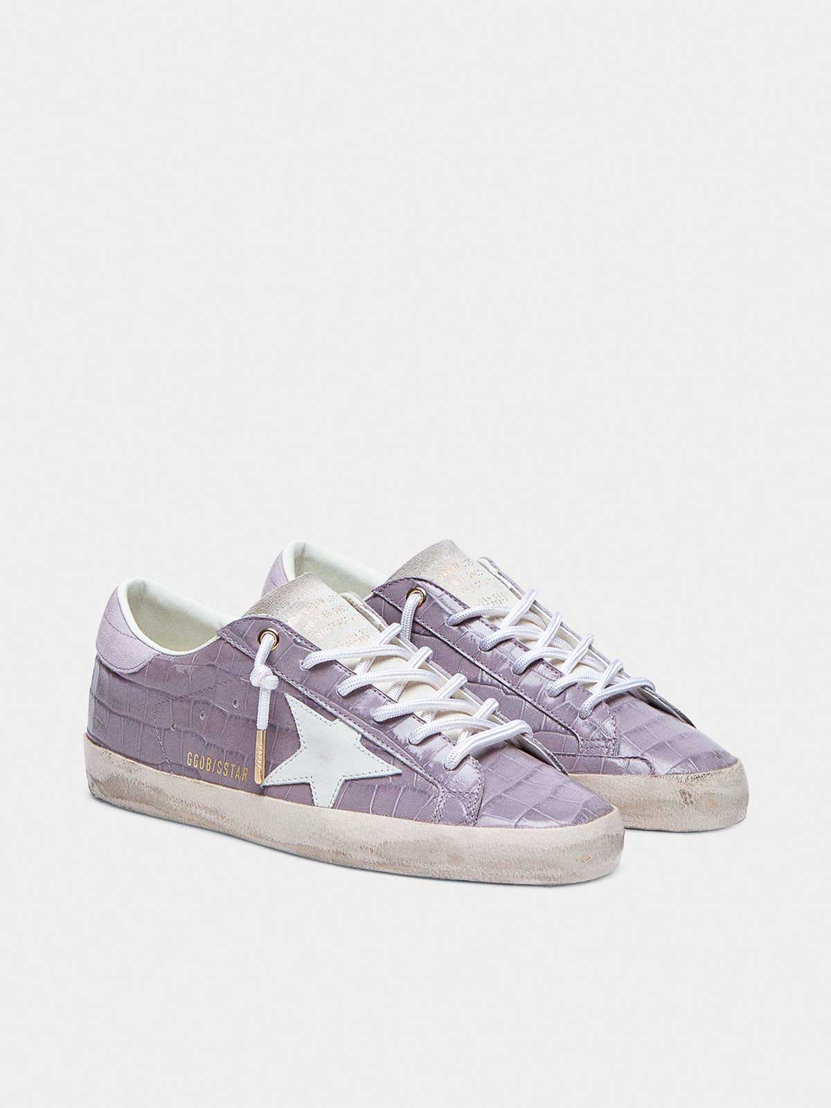 Baskets en cuir modèle Super Star, effet serpent, semelle sale contrastante, lacets à finition métallisée, talon en daim.
