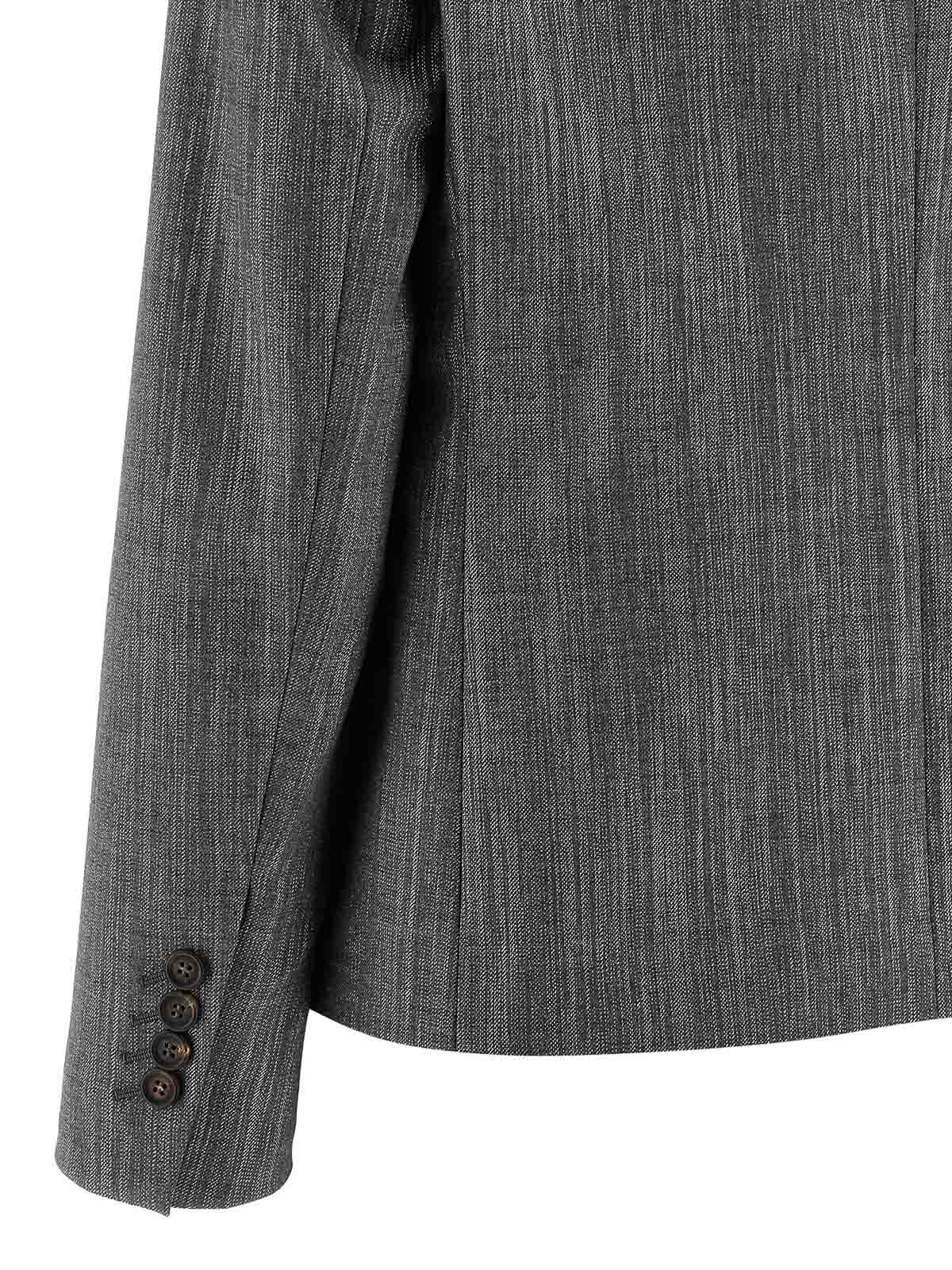 Blazer en twill de laine vierge techno étincelant avec fil de lamelle, style à double boutonnage avec fermeture boutonnée en corne sur le devant, doublure en crêpe de soie mélangée, revers pointus, poche poitrine, poches passepoilées, légèrement au-dessus des épaules, manches longues, détail en moile au dos.
