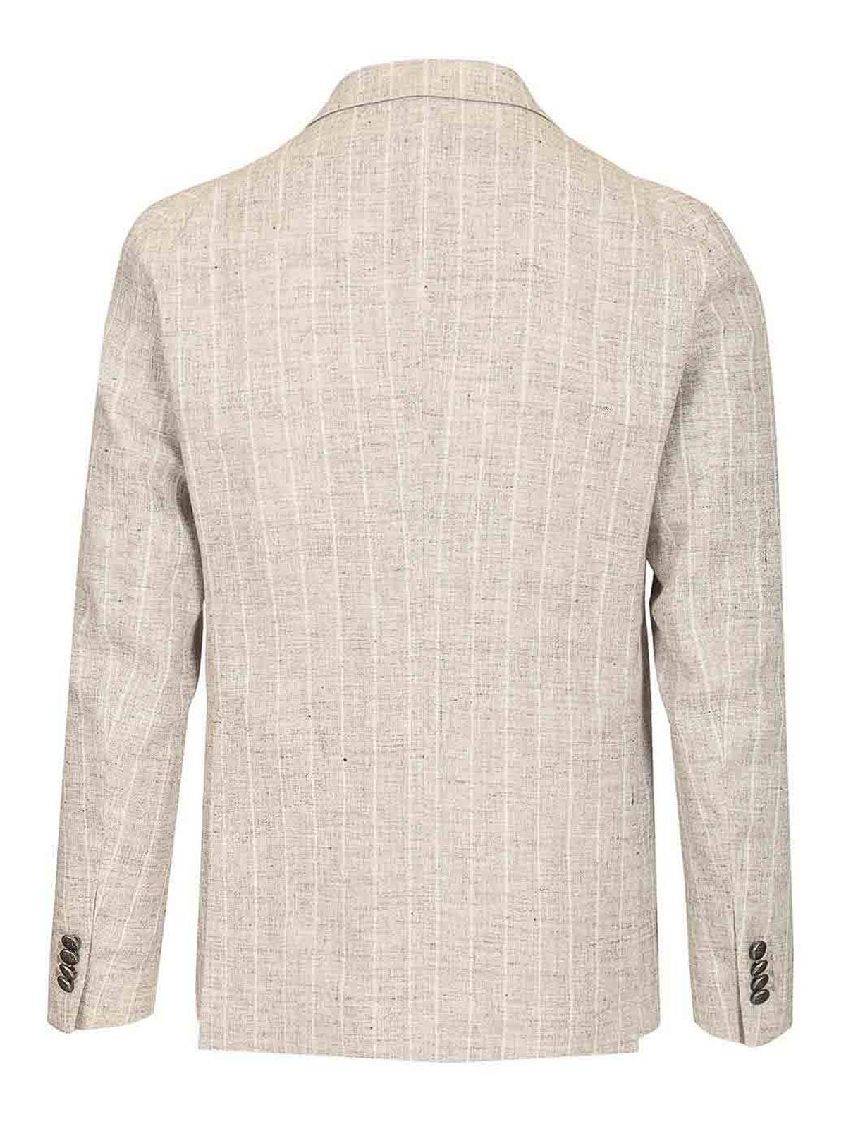 Blazer à double boutonnage en lin mélangé avec revers en pointe à fines rayures, poches plaquées non doublées, double fente arrière et boutons
