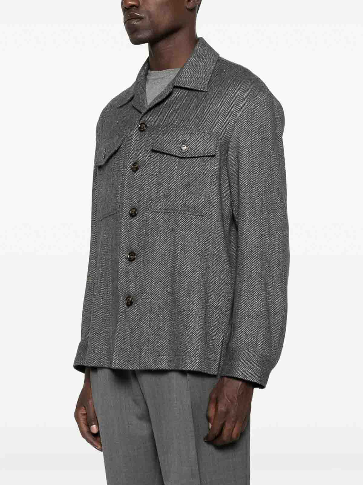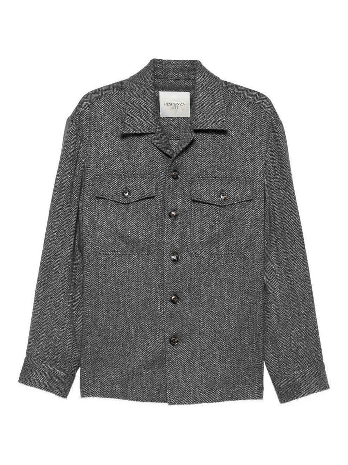 Gris foncé, motif à chevrons, fermeture boutonnée, deux poches à rabat, manches longues