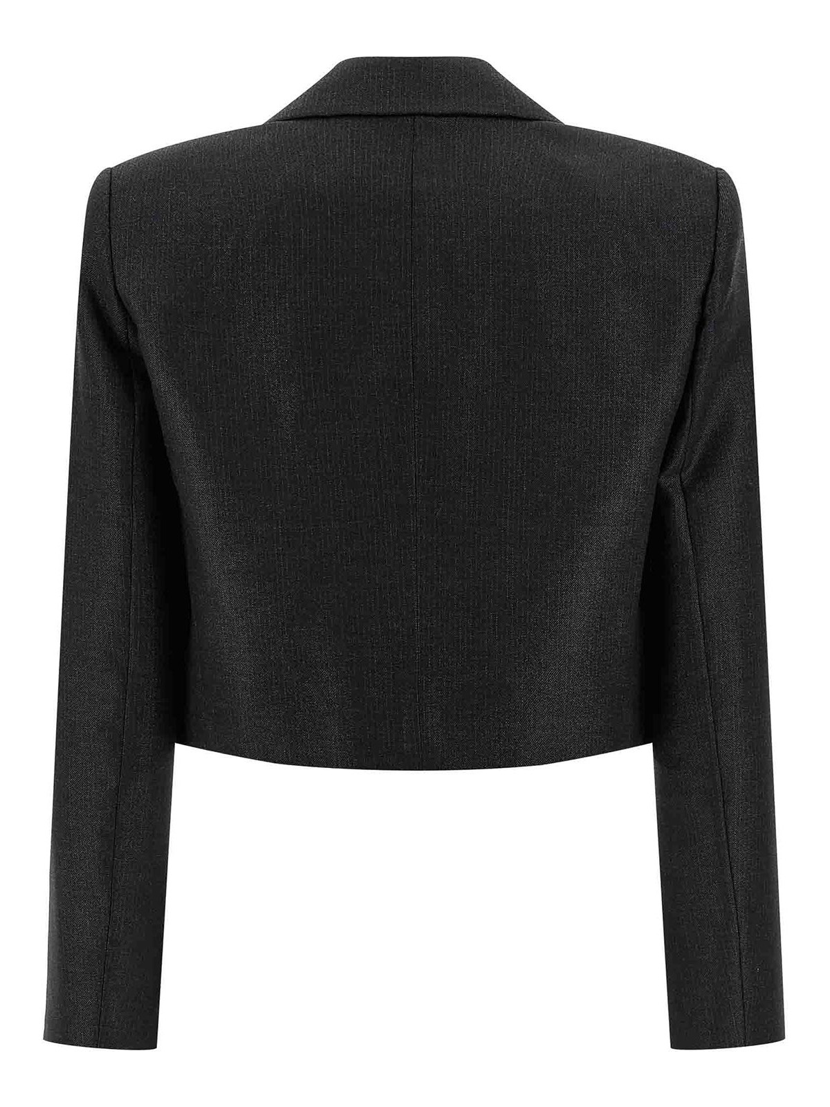 Blazer Eliana en toile de laine mélangée travaillée avec de fins fils métalliques à effet rayé, coupe Spencer, revers miroir, poche poitrine, épaule rembourrée, manches longues, doublure.