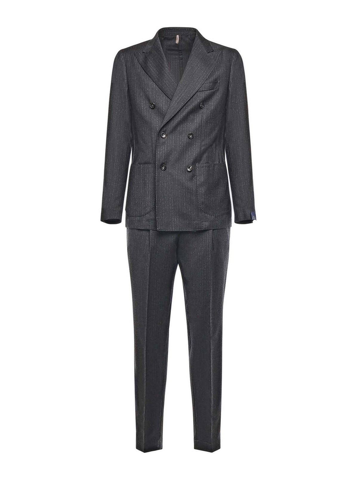 en pure laine, veste à double boutonnage avec deux poches plaquées et une poche poitrine, pantalon avec poches arrière passepoilées, fabriqué en Italie, taille 48, couleur : gris