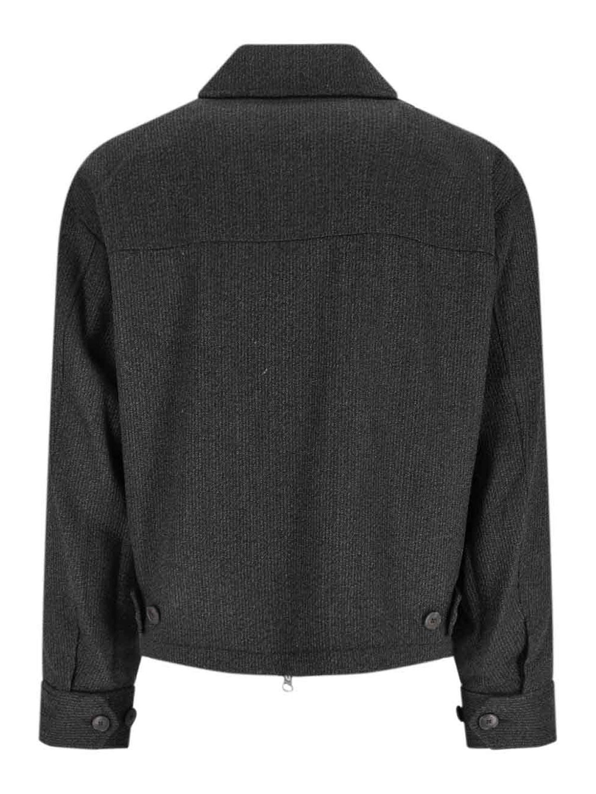 Veste Mfpen mail, en mélange de laine recyclée marron, teinte foncée, col classique, fermeture à double zip, deux poches latérales, une poche plate intérieure, boutons aux poignets, boutons réglables dans le dos, ourlet droit.