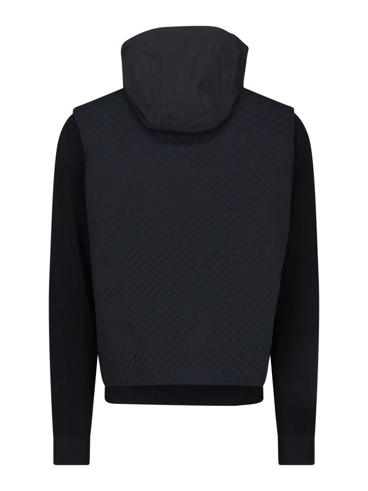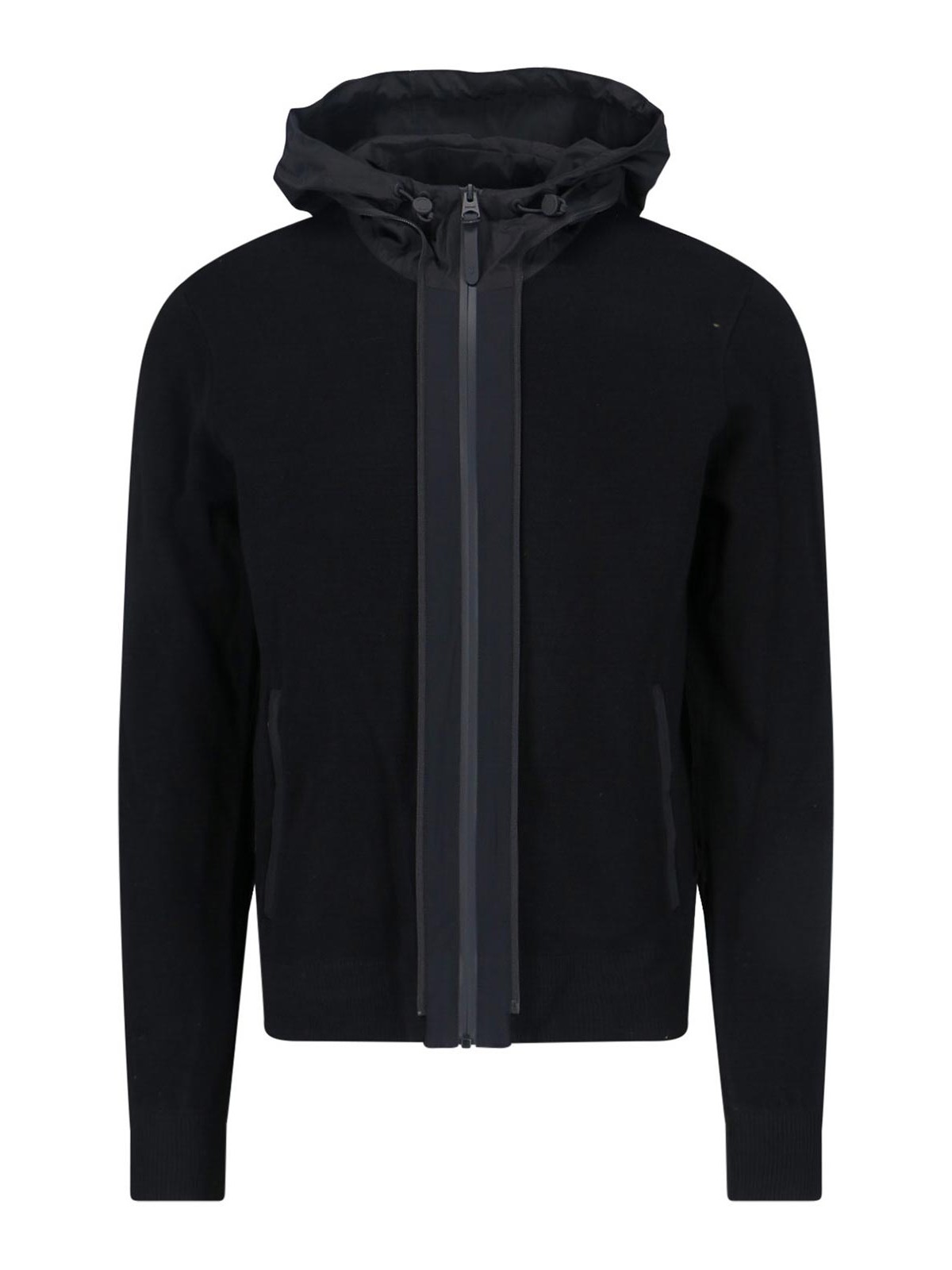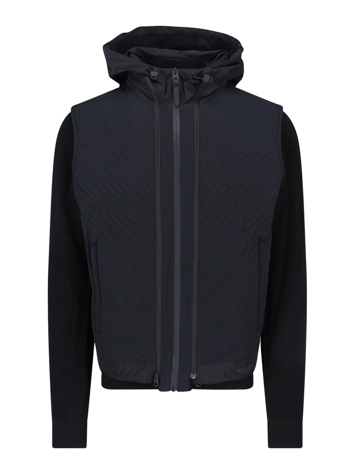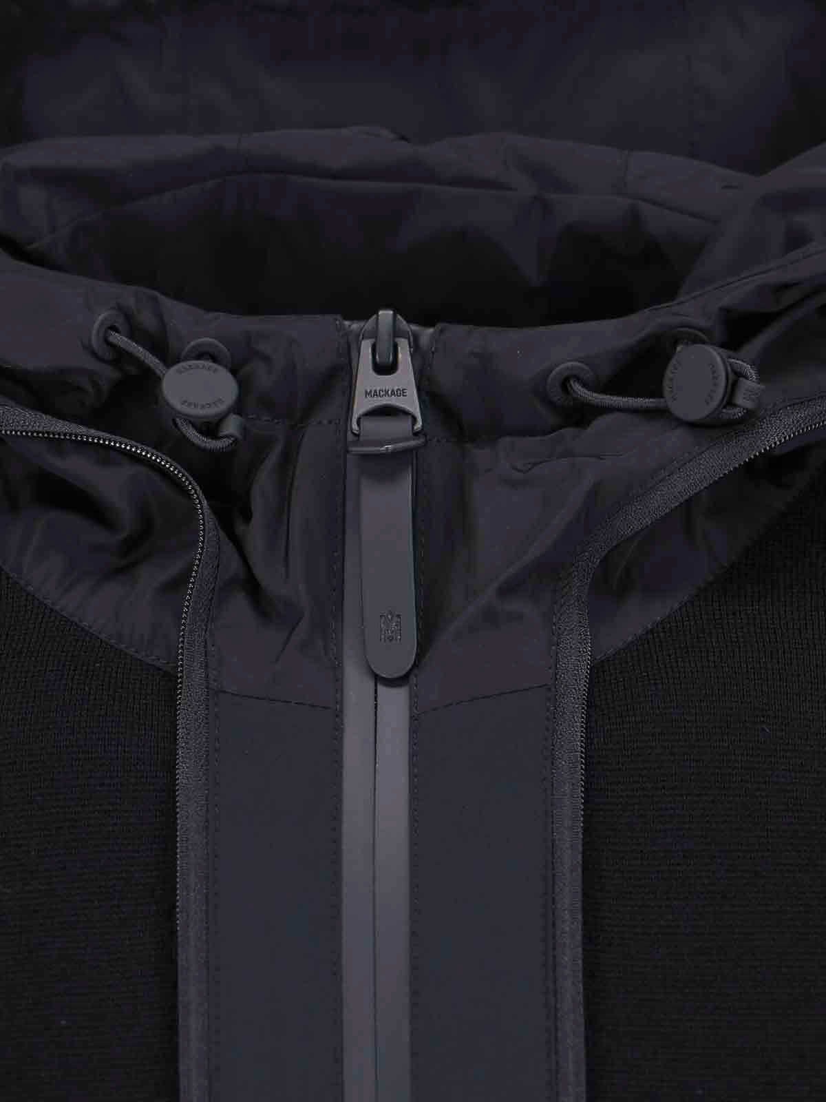 Veste Barrett Mackage, en tissu noir, gilet matelassé amovible et superposé avec fermeture éclair, capuche ajustable avec cordon de serrage, fermeture zippée, manches longues, logo ton sur ton sur ton sur le devant, deux poches avant zippées sur le devant, ourlet droit.