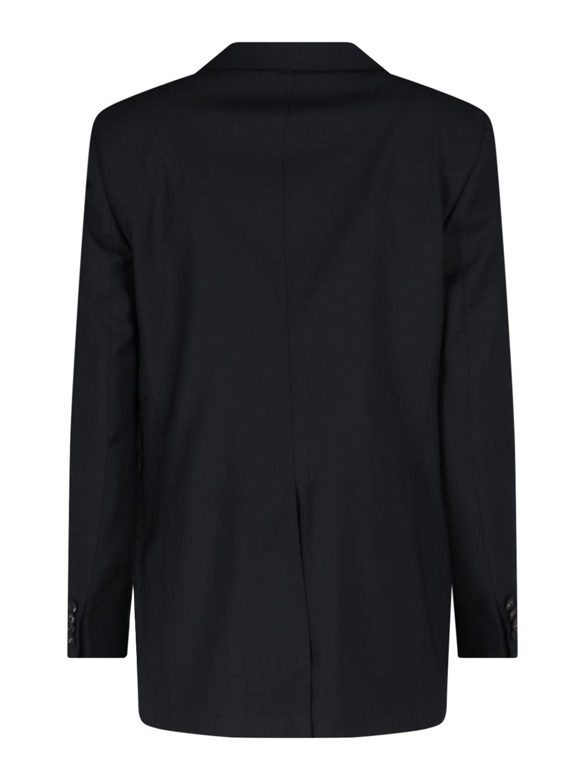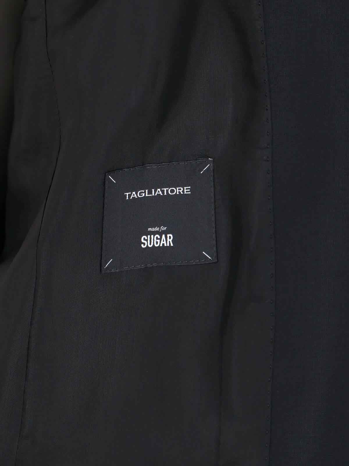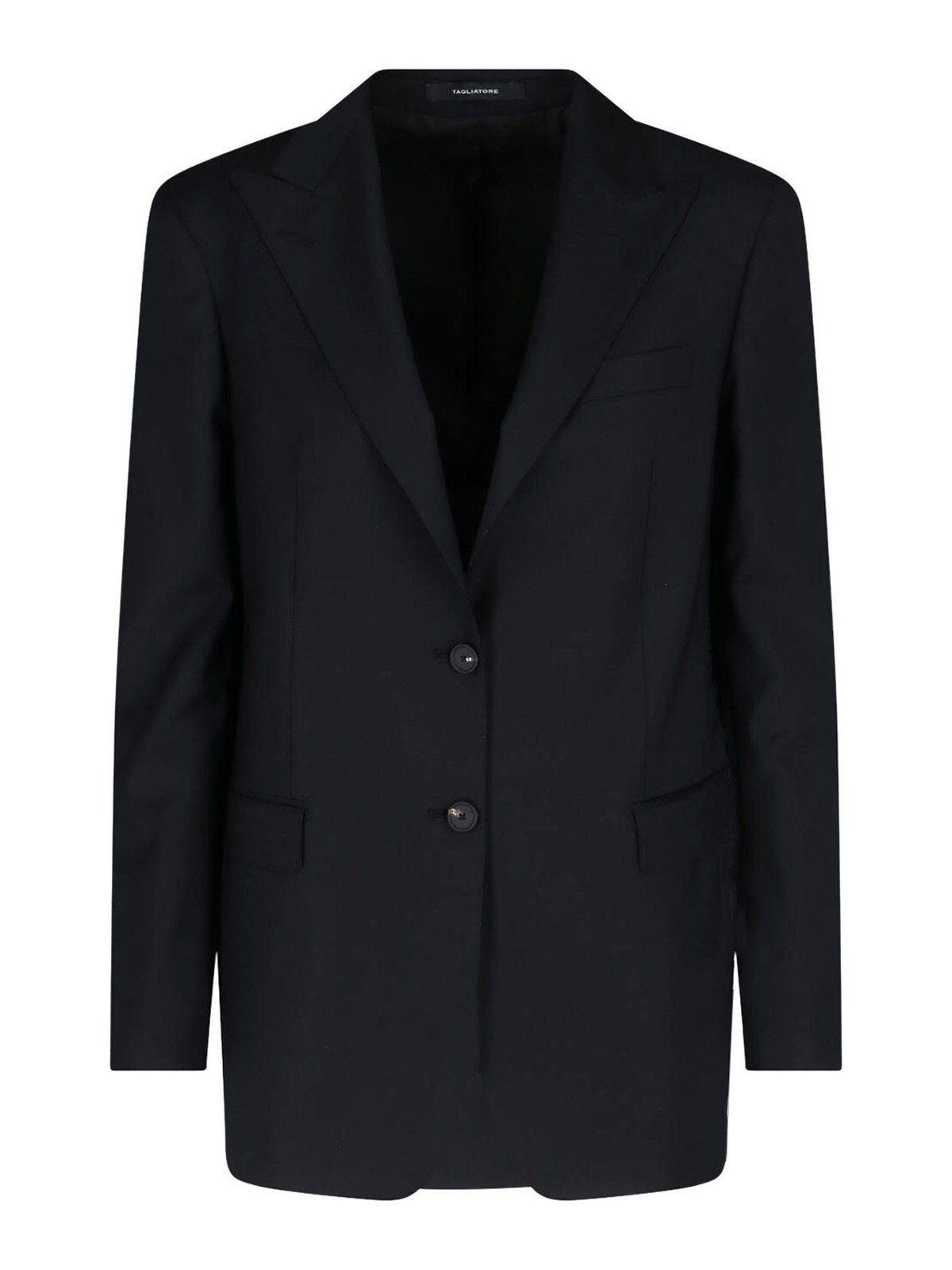 Blazer à boutonnage simple Tagliatore J-Bertha, fabriqué exclusivement pour le sucre, en laine vierge noire, revers pointus, fermeture à deux boutons, poche poitrine, deux poches latérales à rabat, poignets boutonnés, ourlet droit.