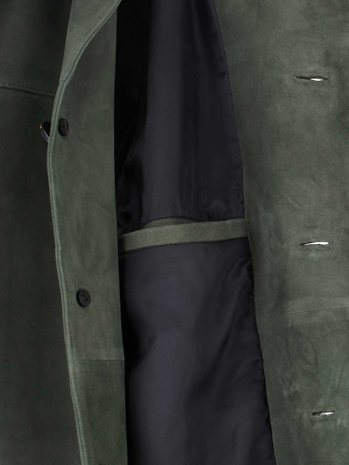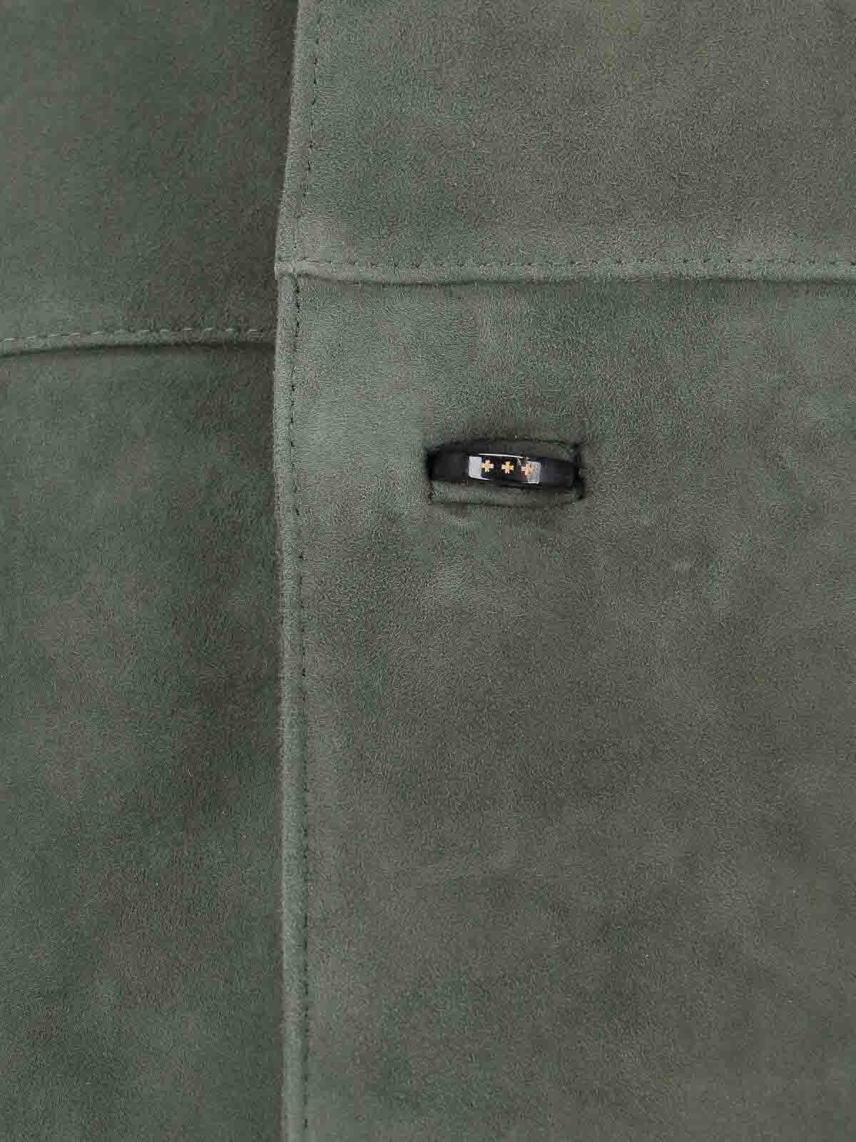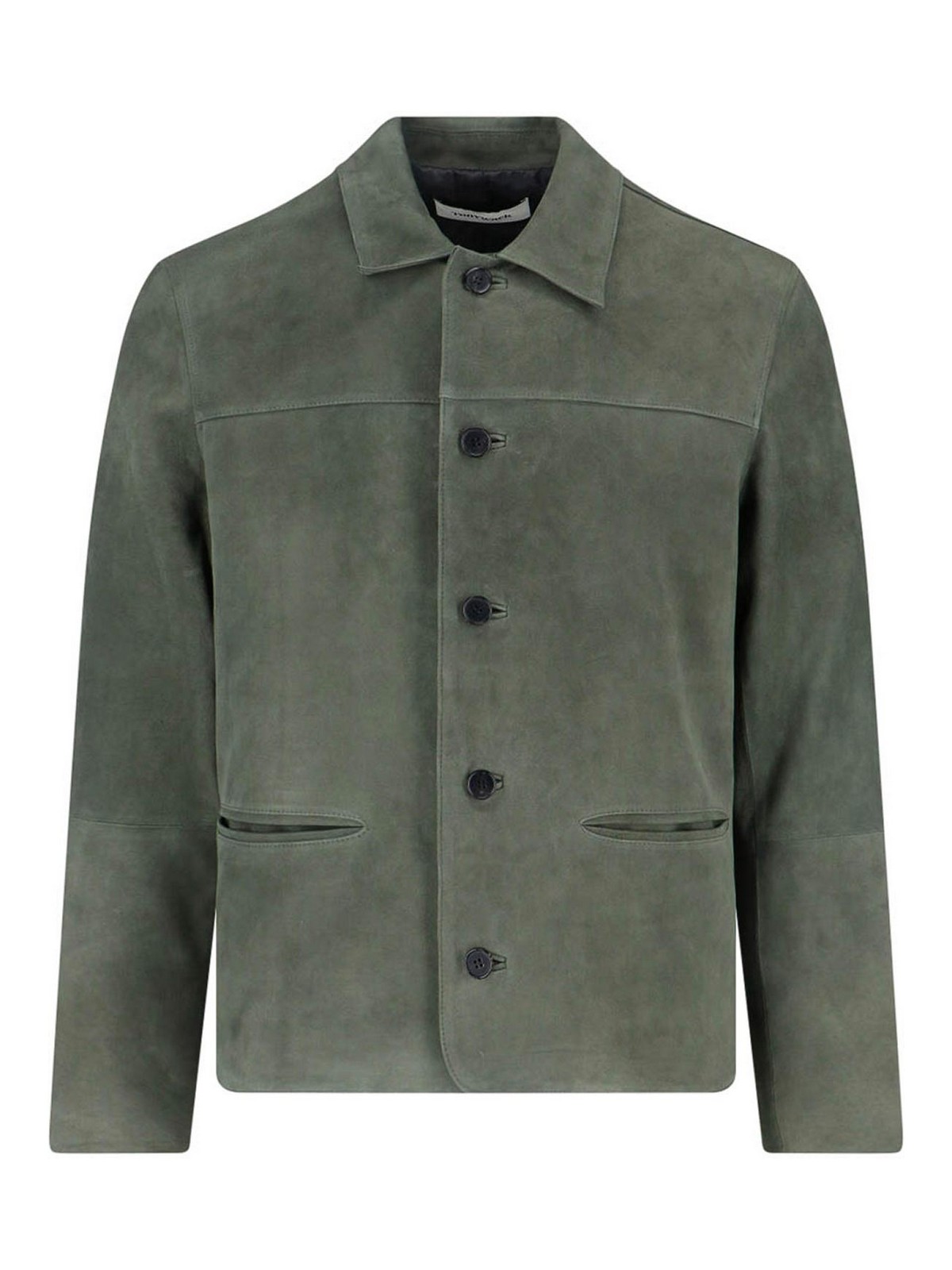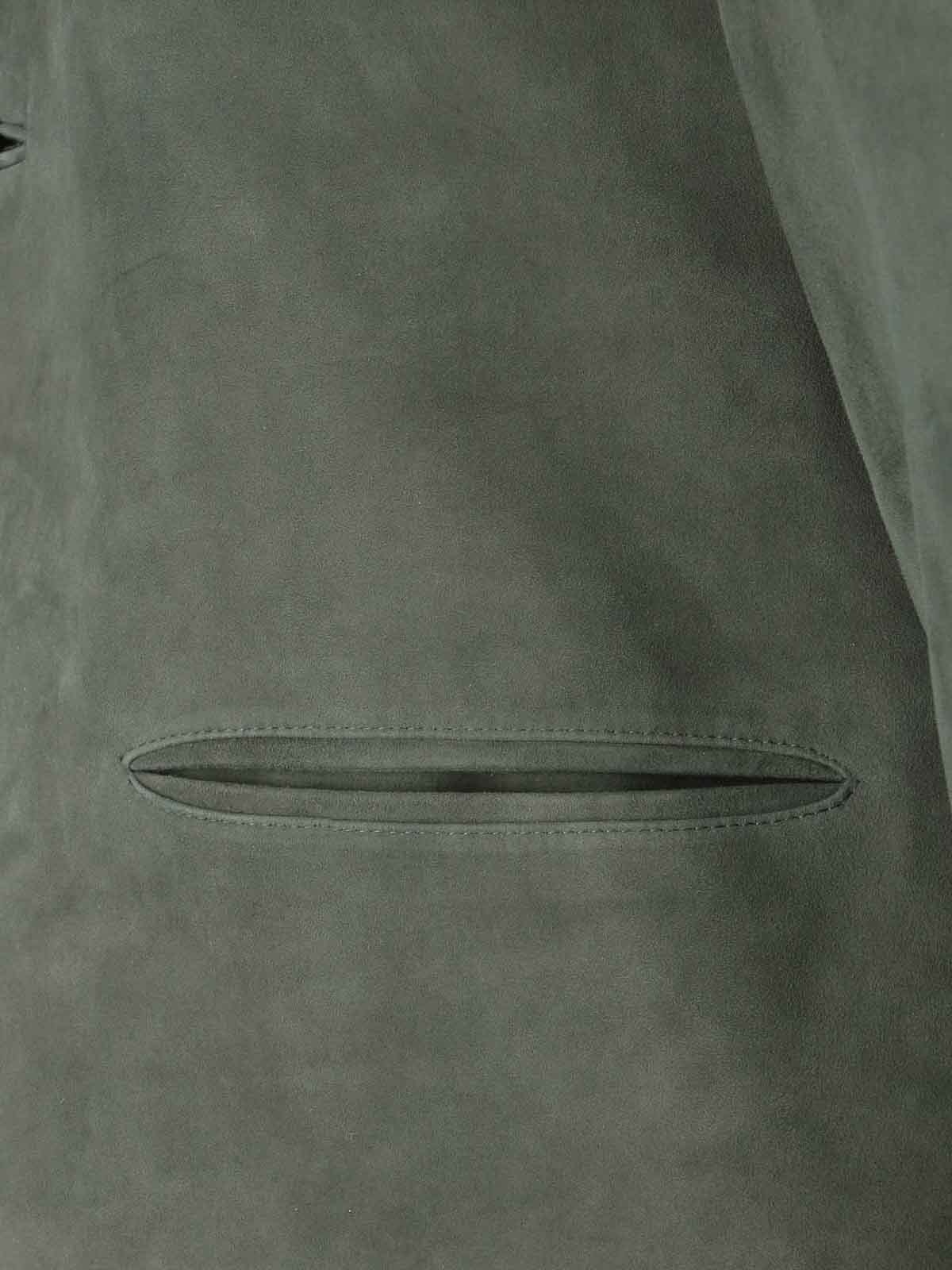 Veste en daim Tonywack, verte, col classique, fermeture boutonnée, manches longues, deux poches passepoilées sur le devant, une poche intérieure plate, ourlet droit.