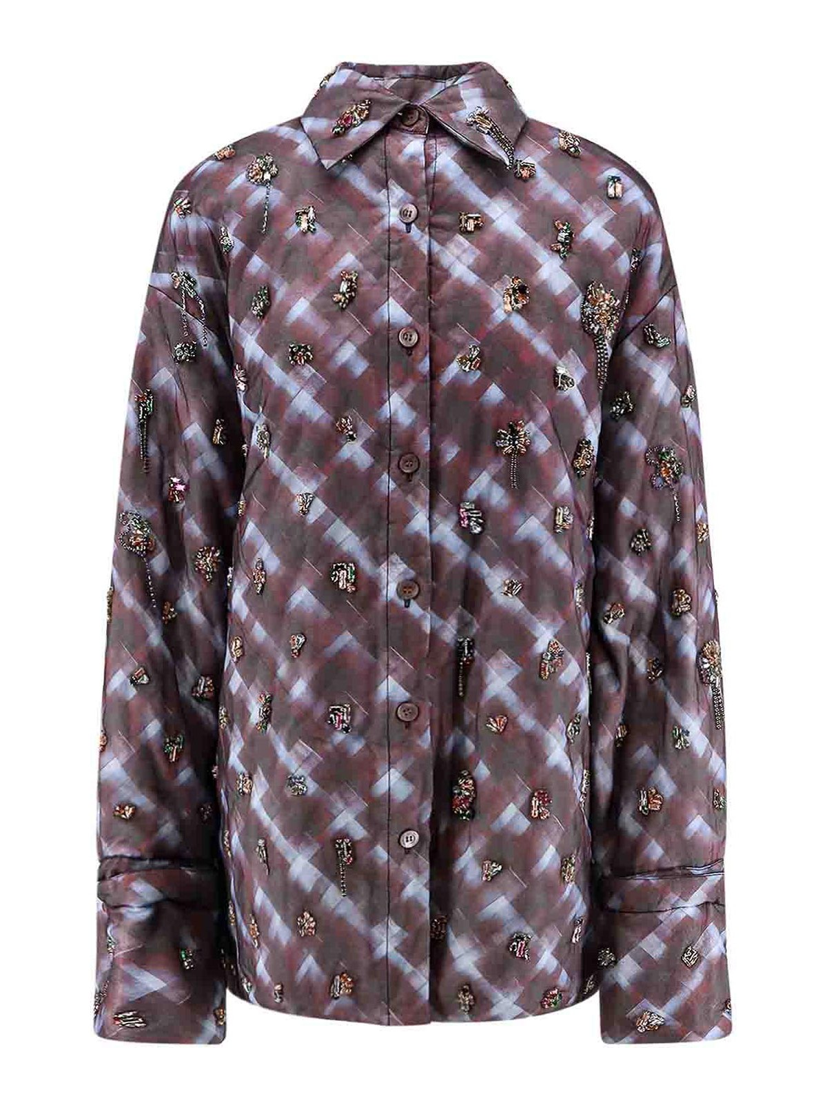 Fermeture boutonnée, col classique, manches longues avec large poignet amovible, décoration en strass sur l'ensemble, 33 % soie, 33 % coton, 32 % polyester, 2 % polyamide, doublure : 100 % viscose.