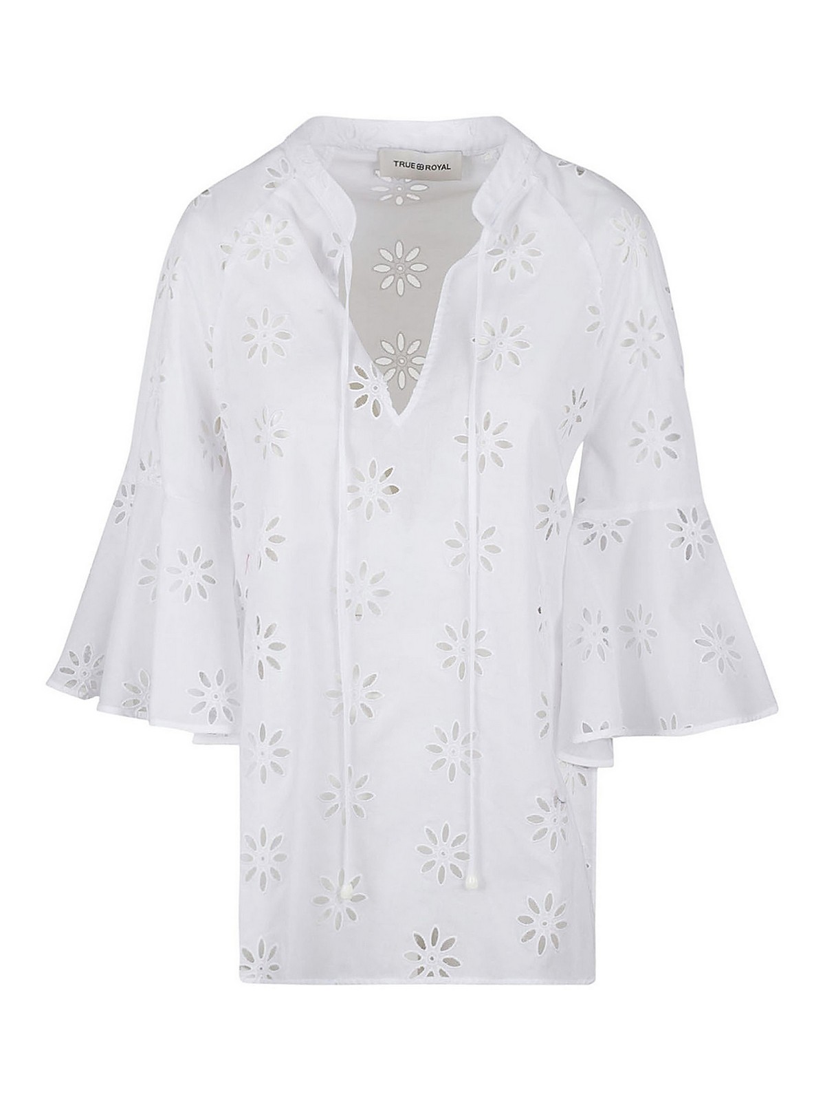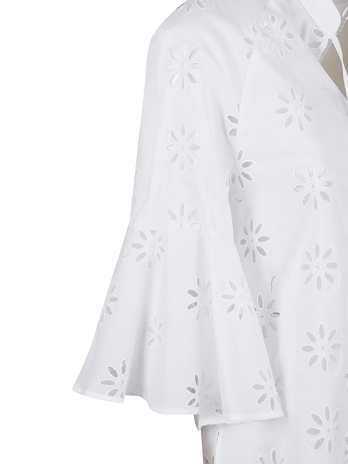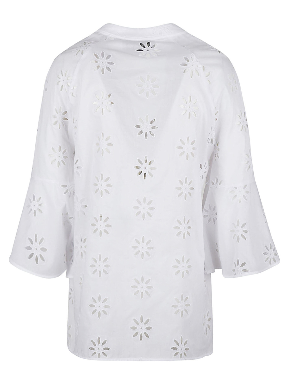 Chemise brodée à col mandarin ornée de lacets, manche à volants, forme arrondie sur le bas avec fentes latérales.
