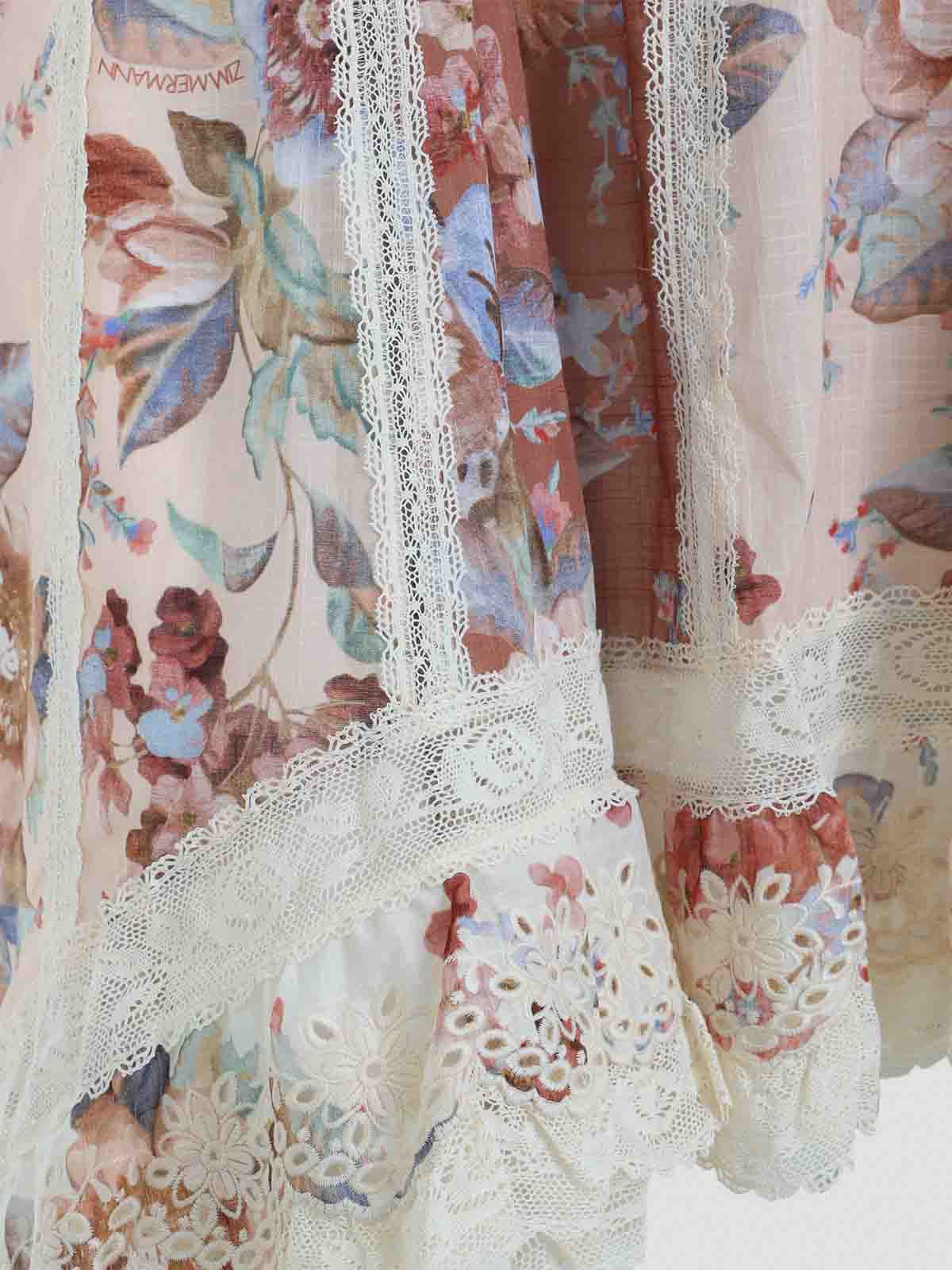 Blouse Zimmermann en coton à imprimé épissé avec bordure en dentelle Awaken. chemisier en pur coton. col rond, détail en dentelle triangulaire blanche sur le devant, fermeture boutonnée au dos, manches longues évasées, ourlet droit, détails de lacets blancs sur les manches et à la taille, motif floral multicolore.