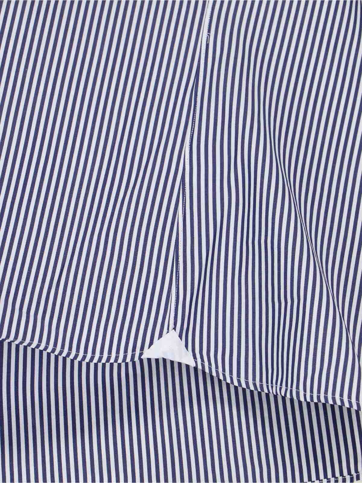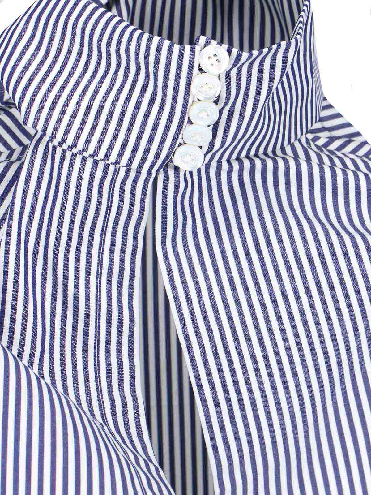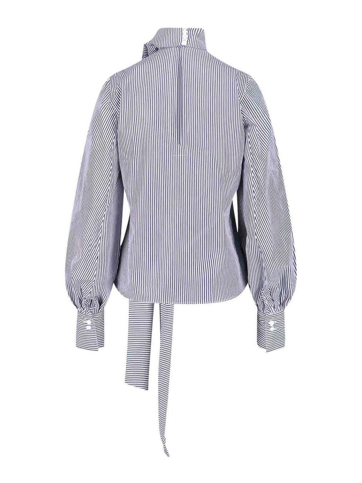 Blouse Lindsay Finamore 1925, en coton bleu et blanc, motif rayé, col haut, fermeture boutonnée au dos, nœud, manches larges, poignets longs avec boutons au dos, logo brodé ton sur ton sur ton sur les côtés, ourlet incurvé.
