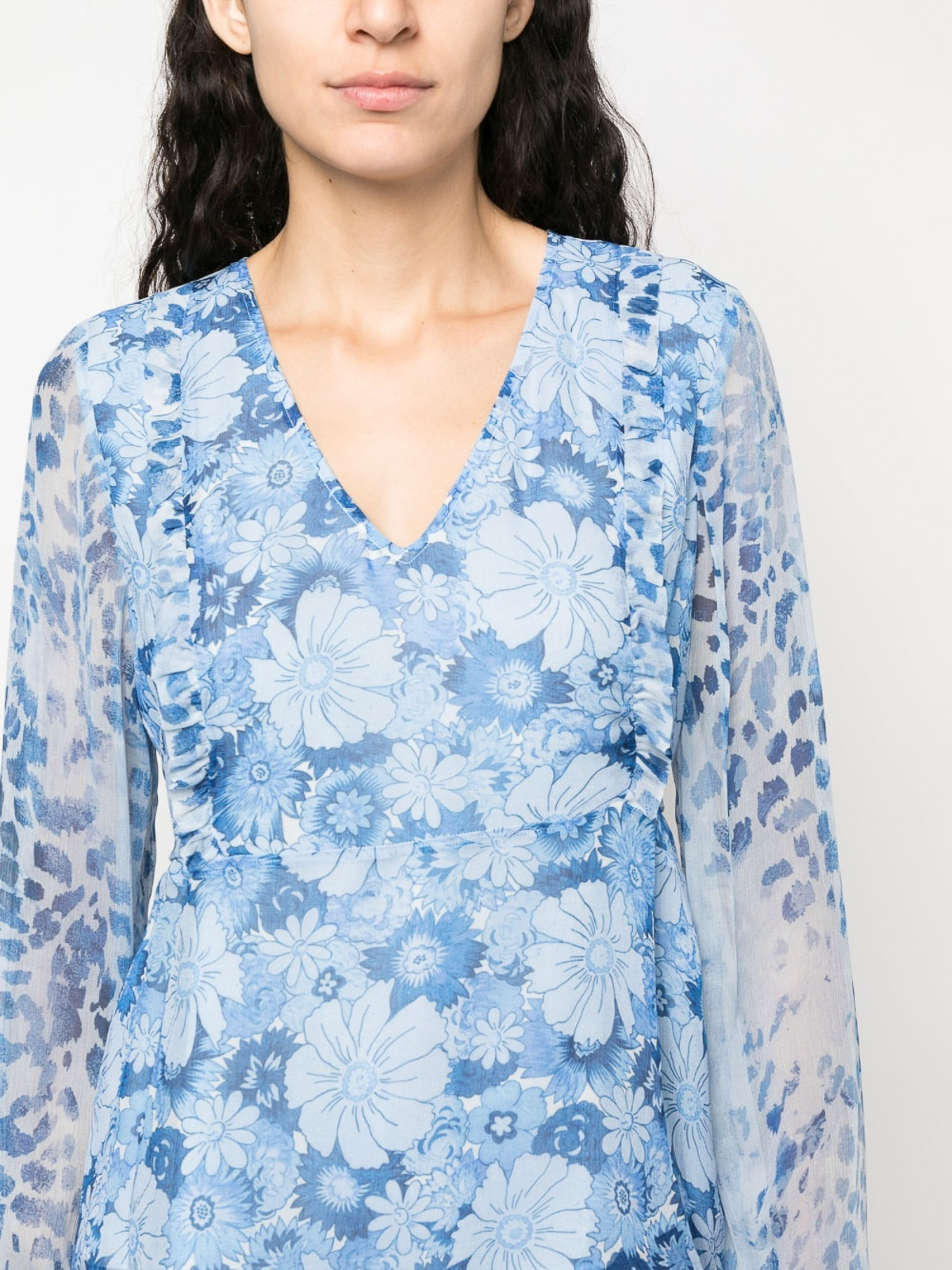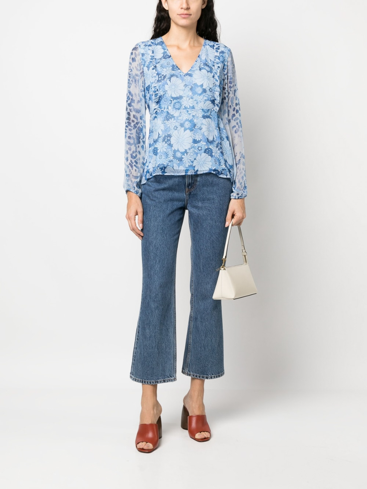 Blouse à manches transparentes à imprimé floral signée Liu Jo ornée d'un imprimé floral intégral bleu clair, d'une plaque logo, d'un col en V, de manches longues transparentes, de poignets élastiqués, d'une taille nouée et d'un ourlet droit.
