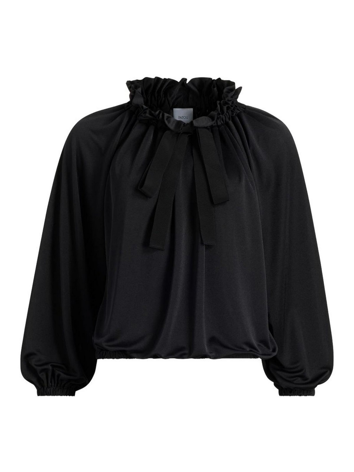 col à cordon avec volant sur le devant, longs liens en gros-grain, manches chauve-souris avec poignets élastiqués, taille élastiquée