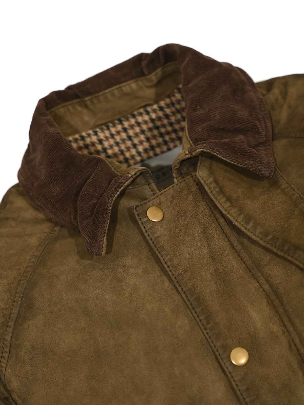 veste en daim Leather Authority, modèle Balmoral Tissu : daim Motif : vert olive uni manches : longues avec ourlets droits Col : velours côtelé marron classique avec cordon de serrage Fermeture : fermeture éclair centrale avec rabat et boutons-pression dorés poches : deux poches à rabat avec boutons-pression, deux poches poitrine verticales Détails : doublure pied de poule, coutures renforcées, inspirées des vestes de chasse anglaises doublées : oui coupe : classique