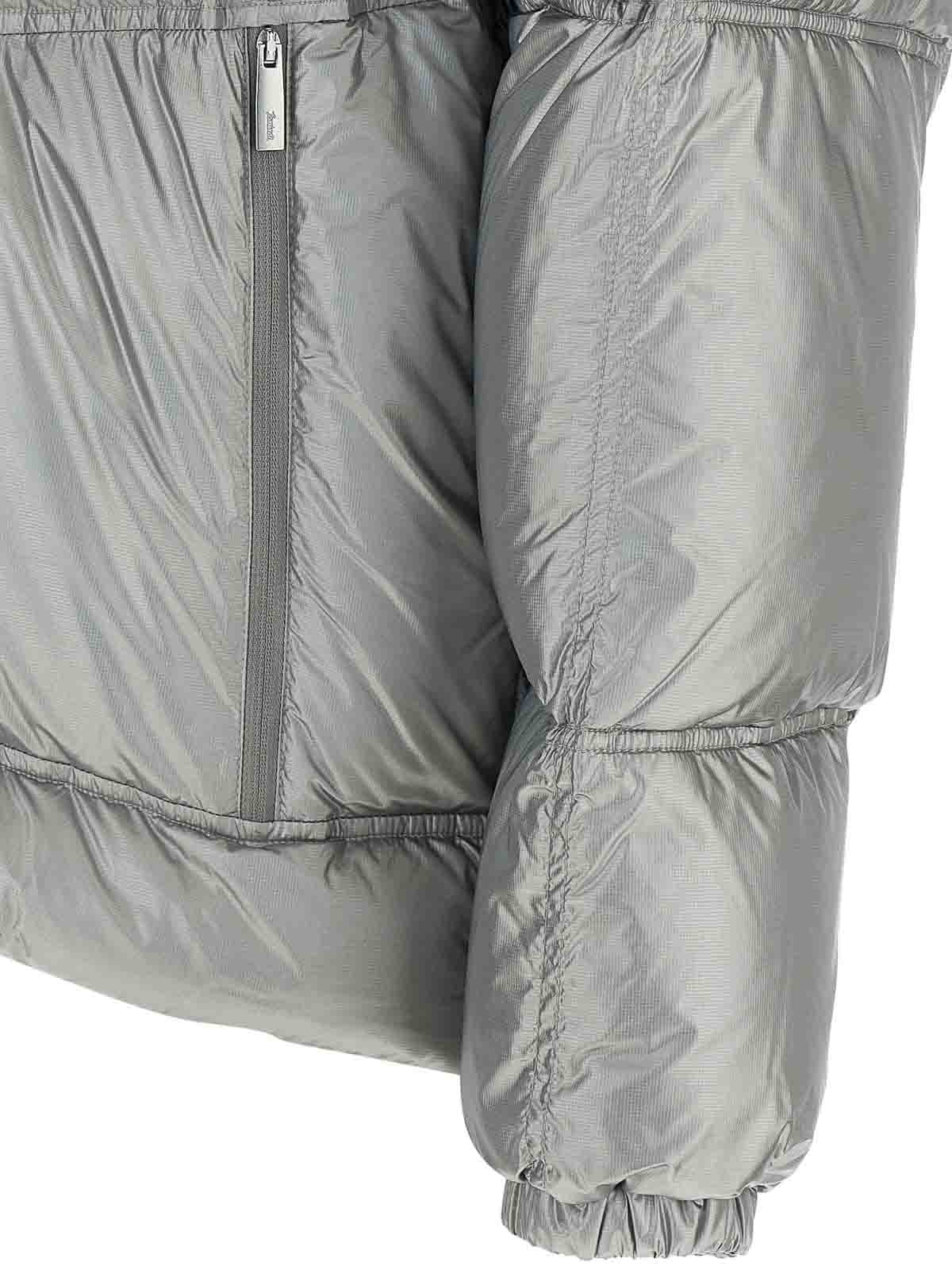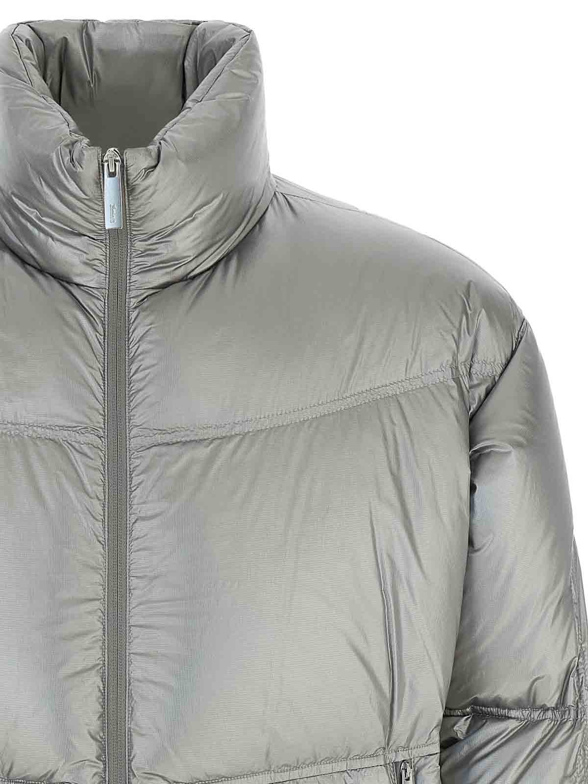 Doudoune en nylon Metallic Shield avec revêtement en titane matelassé et rembourrage en plumes d'oie, col montant, fermeture zippée sur le devant, poches, manches longues avec poignets élastiques et épaule tombante, cordon de serrage à l'ourlet