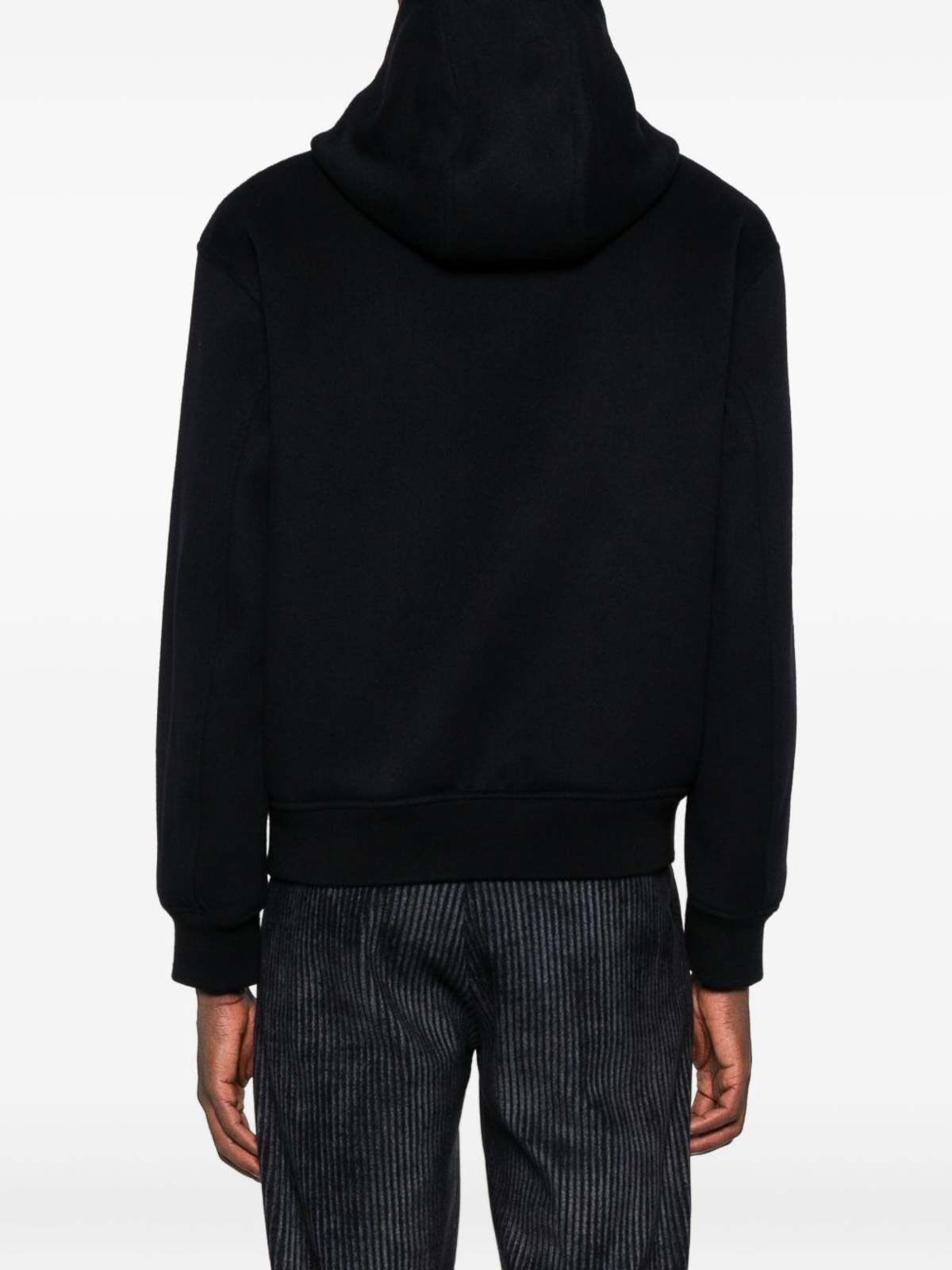 Bleu nuit, fermeture zippée bidirectionnelle sur le devant, manches longues, poignets et ourlet côtelés, capuche à cordon