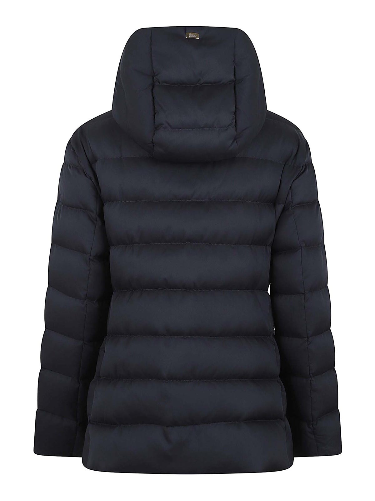 Doudoune Herno avec fermeture éclair à double curseur, capuche enveloppante boutonnée, deux poches passepoilées inclinées avec fermeture éclair, coupe classique.