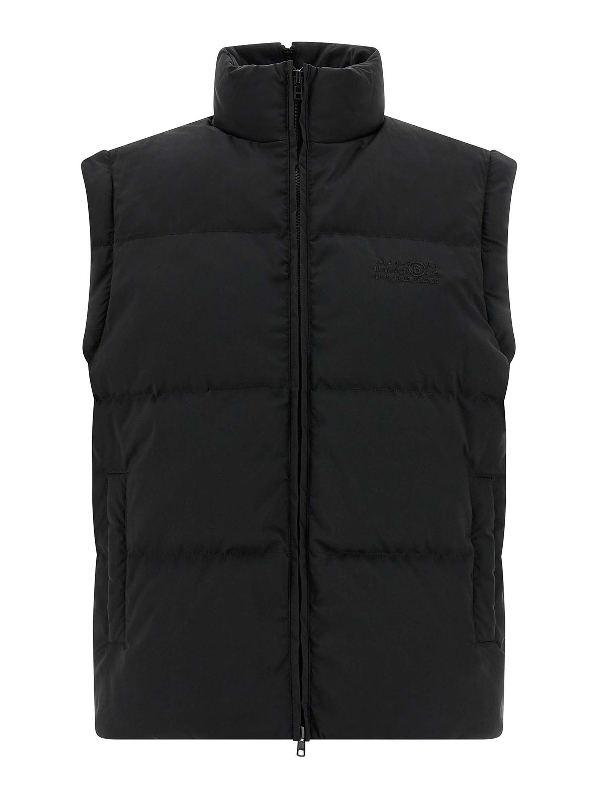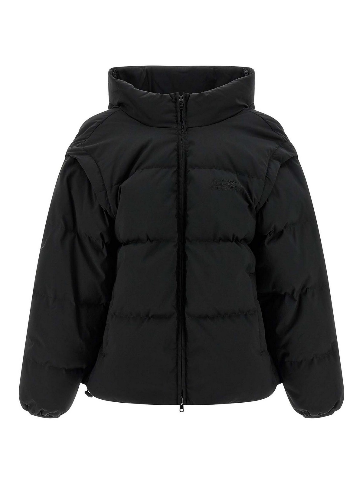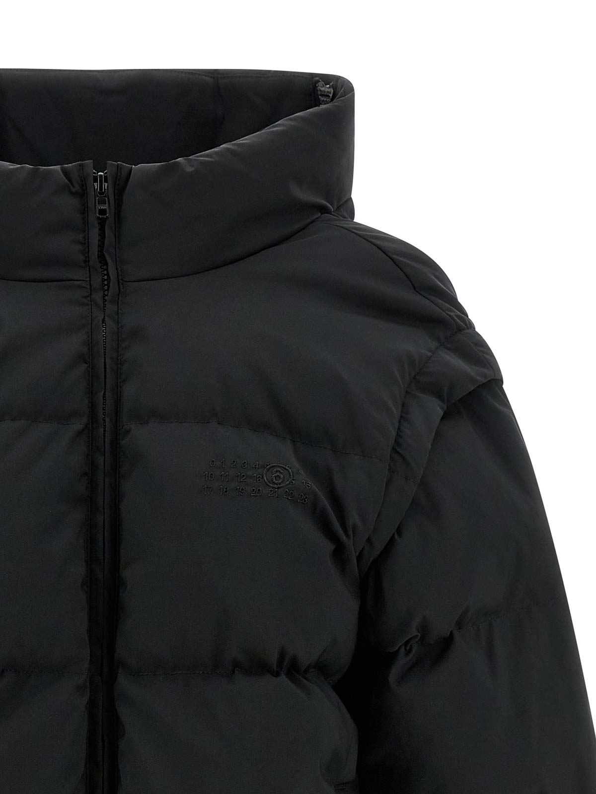 Doudoune en tissu matelassé et rembourré en plumes d'oie, broderie « signature numérique mm6 » ton sur ton et fermeture zippée sur le devant, col haut en forme d'entonnoir, poches, manches longues amovibles avec élastique, cordon de serrage à l'ourlet, panneau arrière extensible avec fermeture éclair.