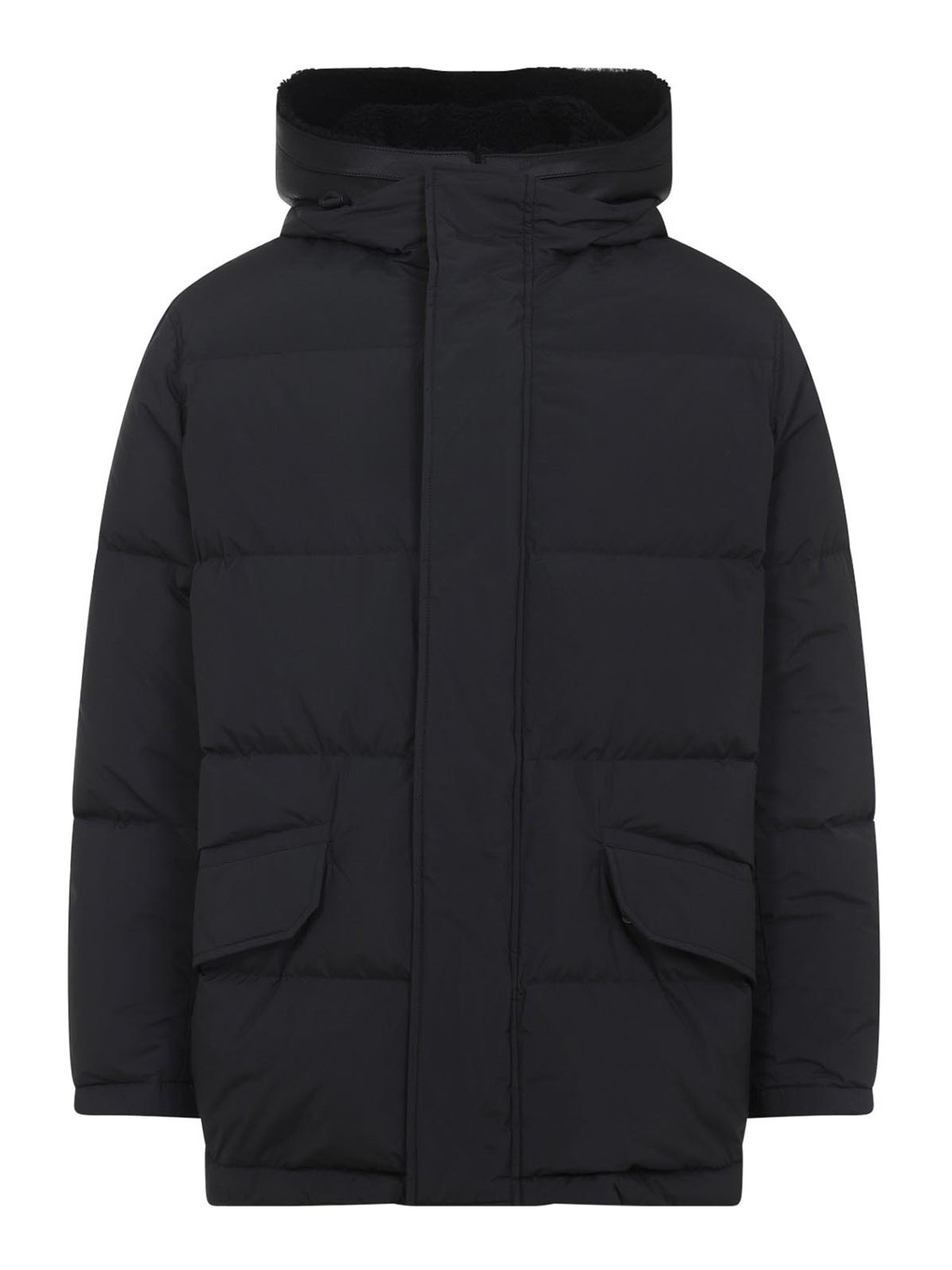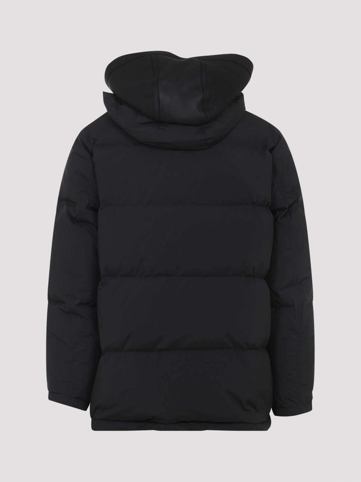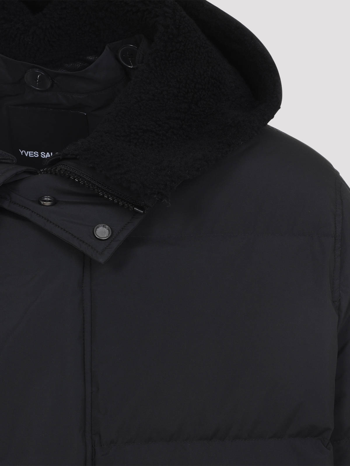 Doudoune noire Yves Salomon confectionnée et ton sur ton, capuche amovible, col montant dissimulant, poches latérales zippées à rabat, manches longues, ourlet droit, design rembourré