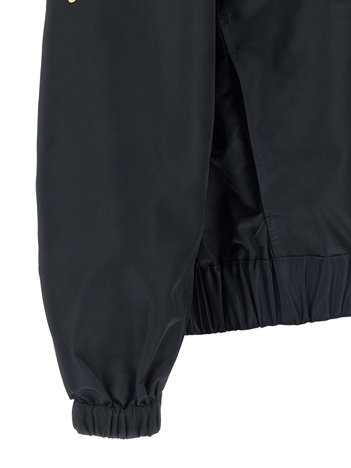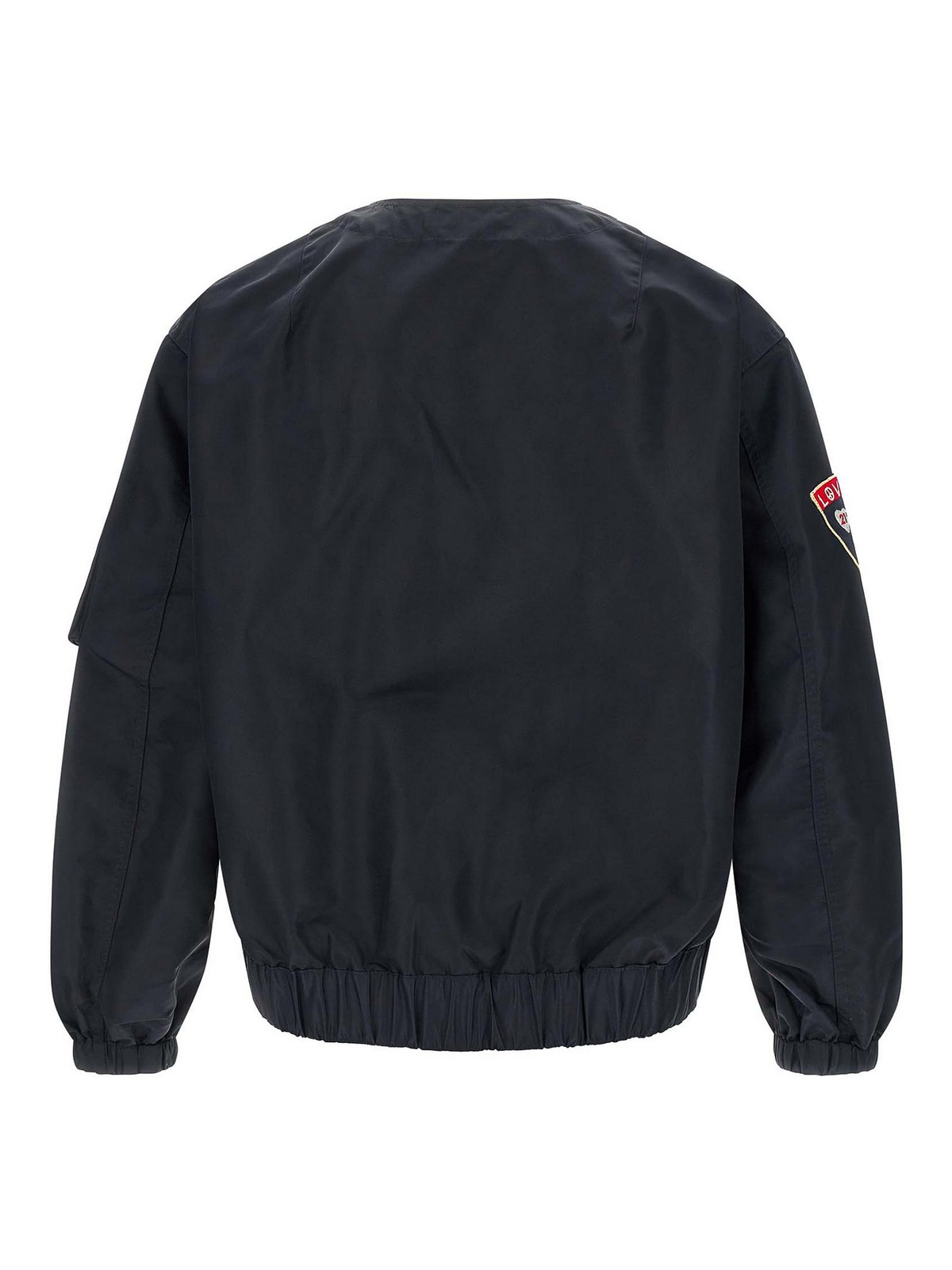 Blouson bomber en nylon sans col Badges avec col en V, fermeture avant avec fermeture éclair en métal, patch avant, poche sur la manche, ourlet frisé avec élastique.