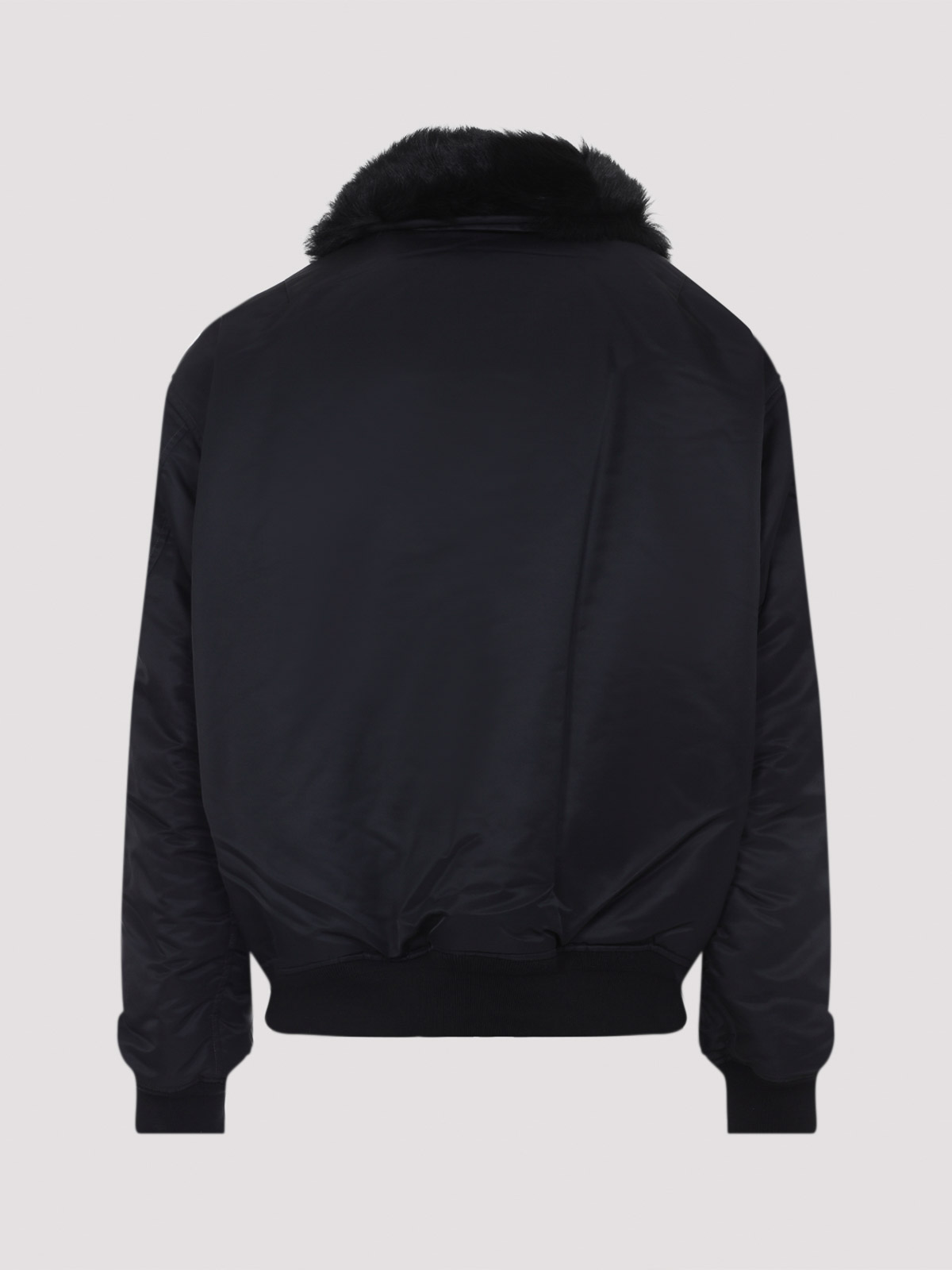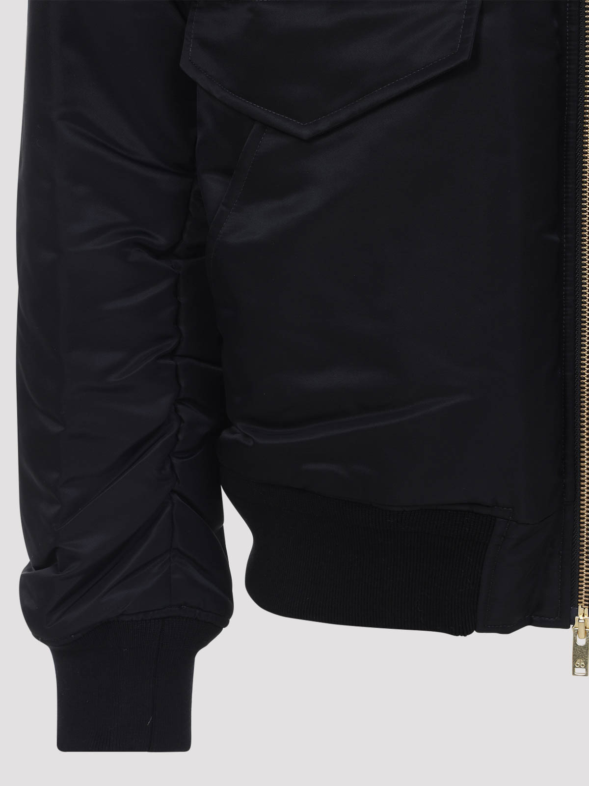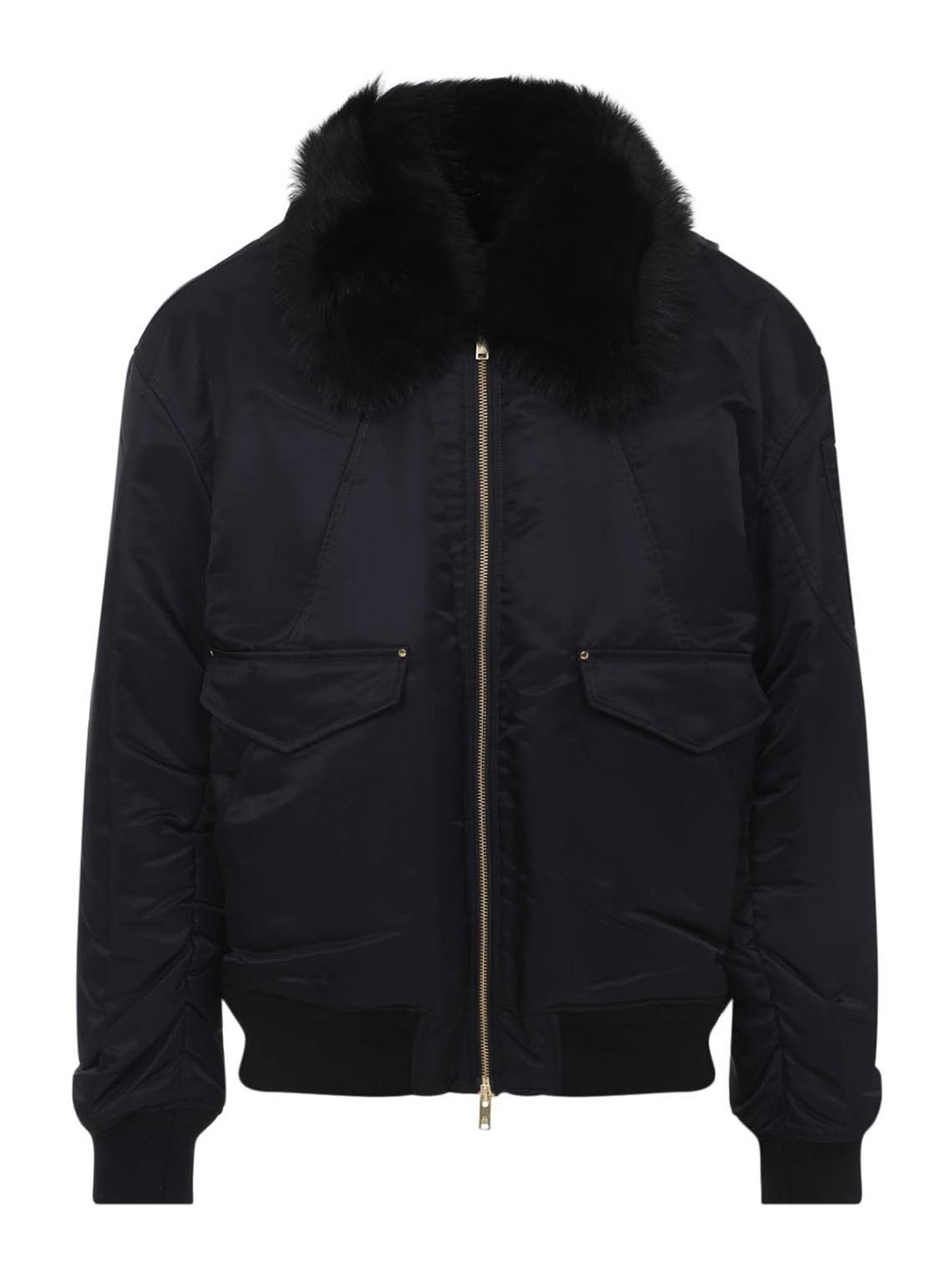Bomber Lugo noir Moose Knuckles, col pointu en fourrure, poches latérales zippées à rabat, manches longues, poche plaquée zippée sur la droite, logo ton sur la droite, poignets et ourlet côtelés, ourlet droit