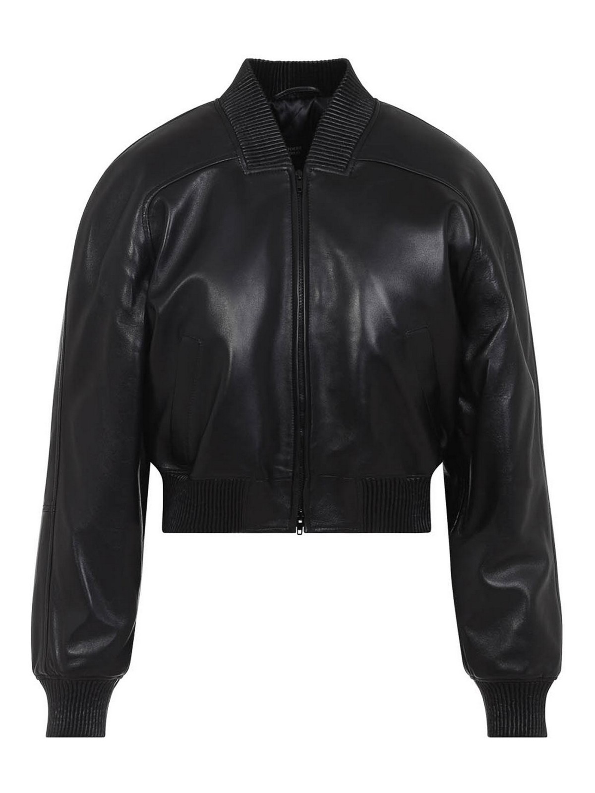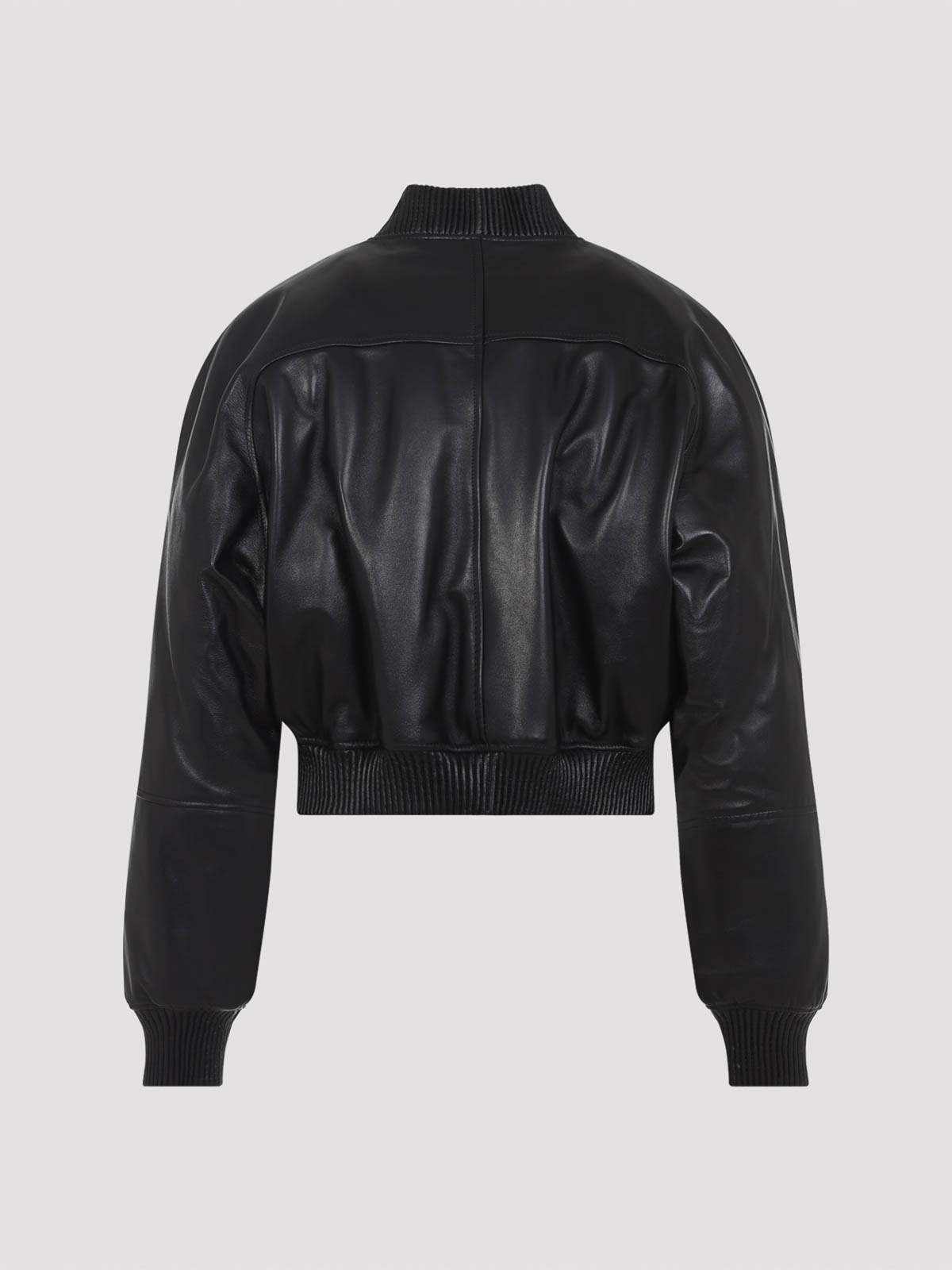 Bomber rétréci Phoebe Philo en cuir noir. cuir noir, manches longues, col, poignets et ceinture côtelés. Fermeture zippée sur le devant. Poches latérales entièrement doublées.
