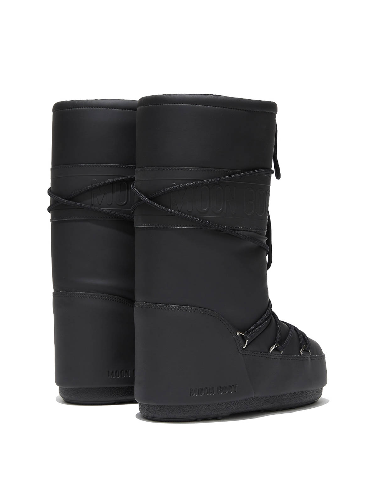 Botte en caoutchouc Icone en noir. Ces bottes de neige Moon Boot en caoutchouc présentent une silhouette inspirée de l'atterrissage sur la lune de 1969. Ils ont une tige haute et des lacets tubulaires entrecroisés. L'extérieur est orné d'une bande logo ton sur ton et d'un logo gravé, tandis que l'intérieur est doublé de tissu isolant. La tige haute est ambidextre. 100 % hydrofuge. La bande logo, le logo gravé, les œillets métalliques, les lacets tubulaires entrecroisés, le cordon de serrage réglable, la semelle intermédiaire en caoutchouc thermoplastique et la bande de roulement en caoutchouc antidérapante.