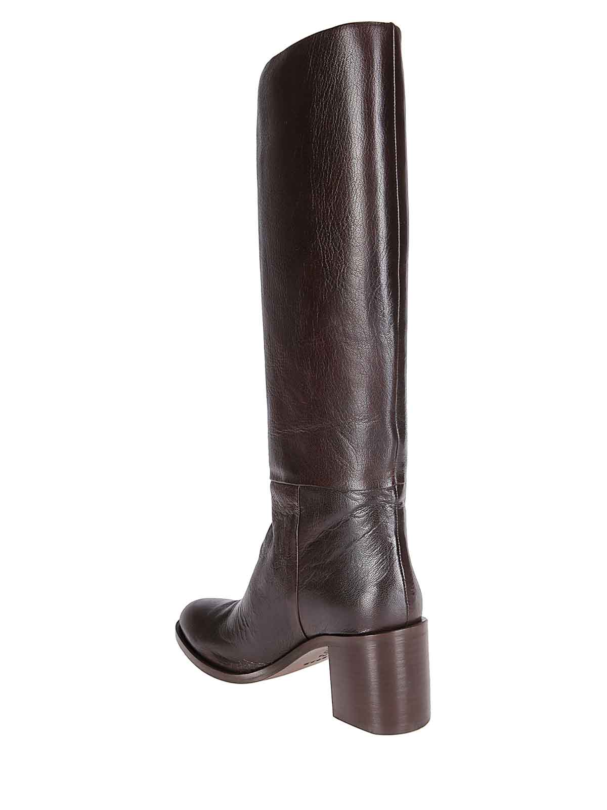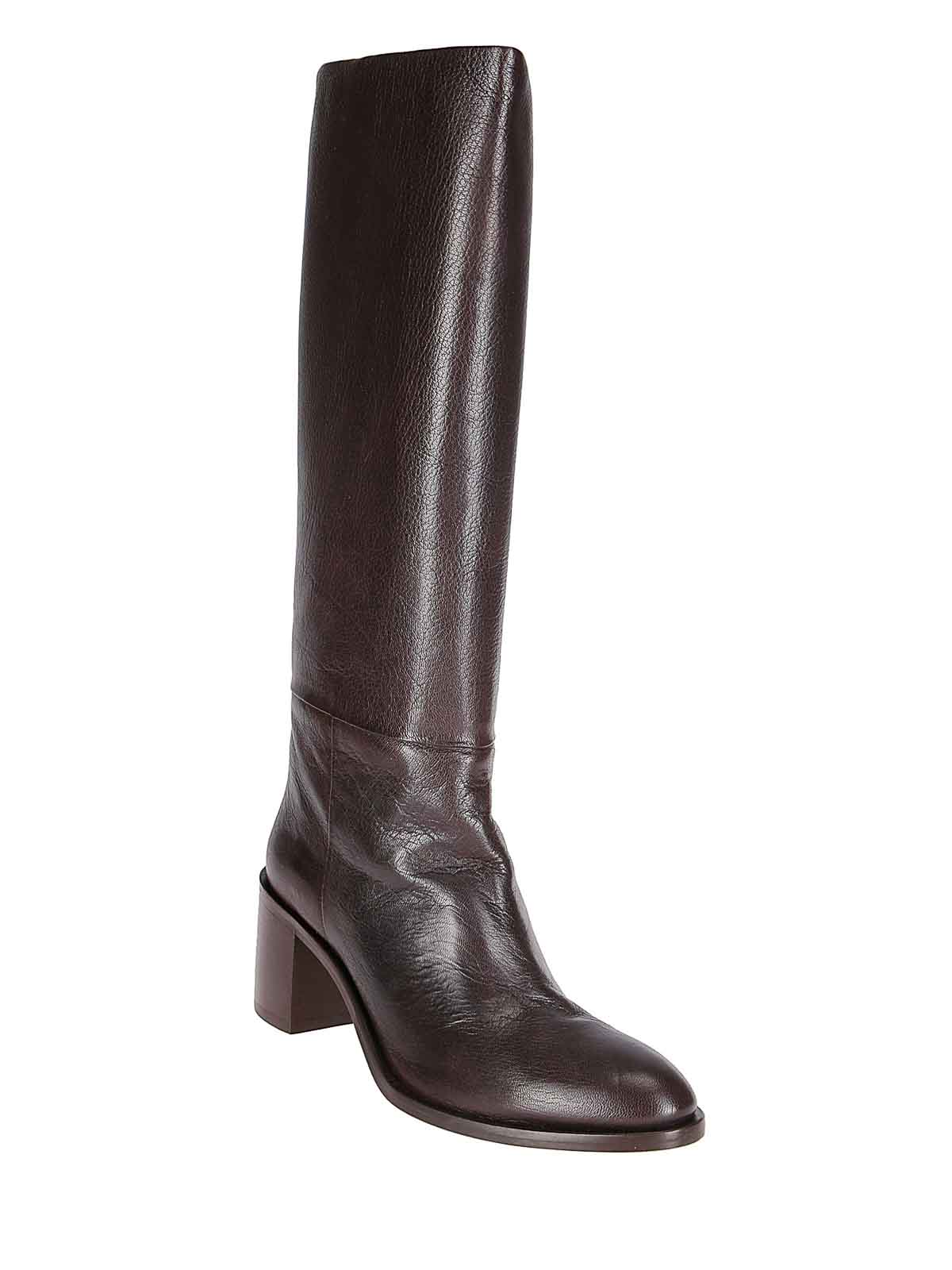 Bottes en cuir à talon moyen, silhouette simple, design linéaire, sans fermetures.
