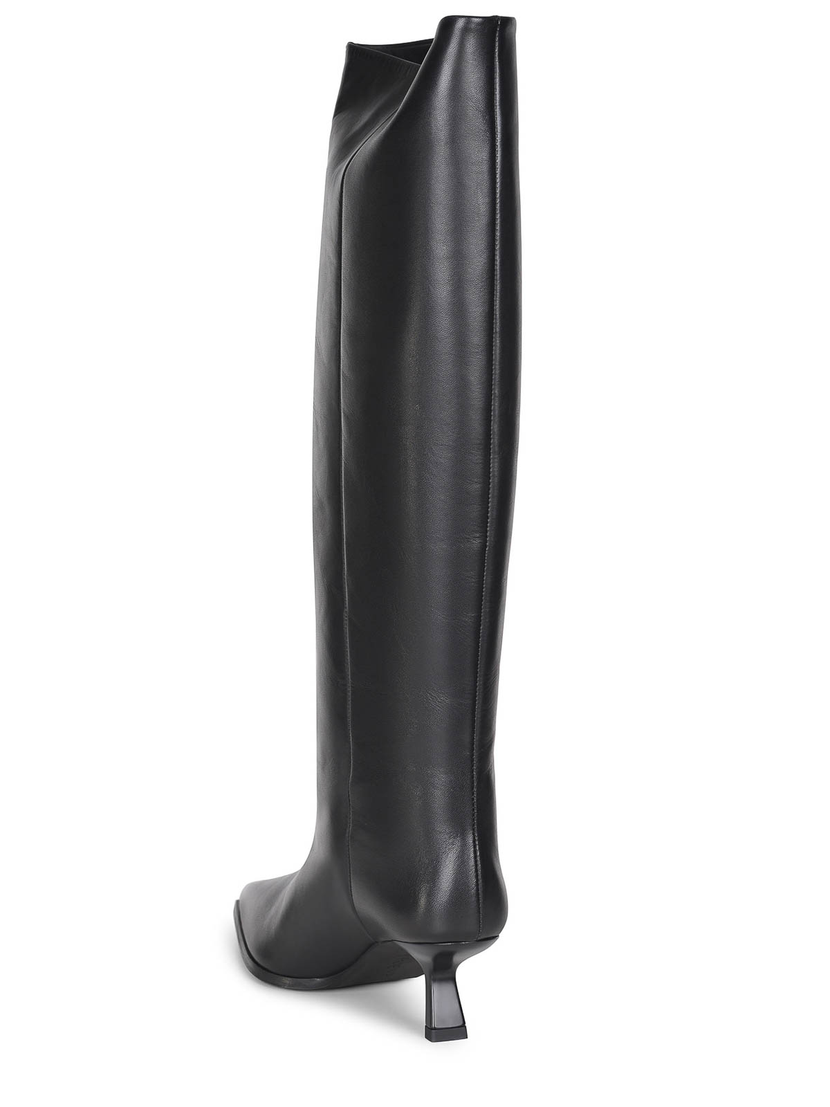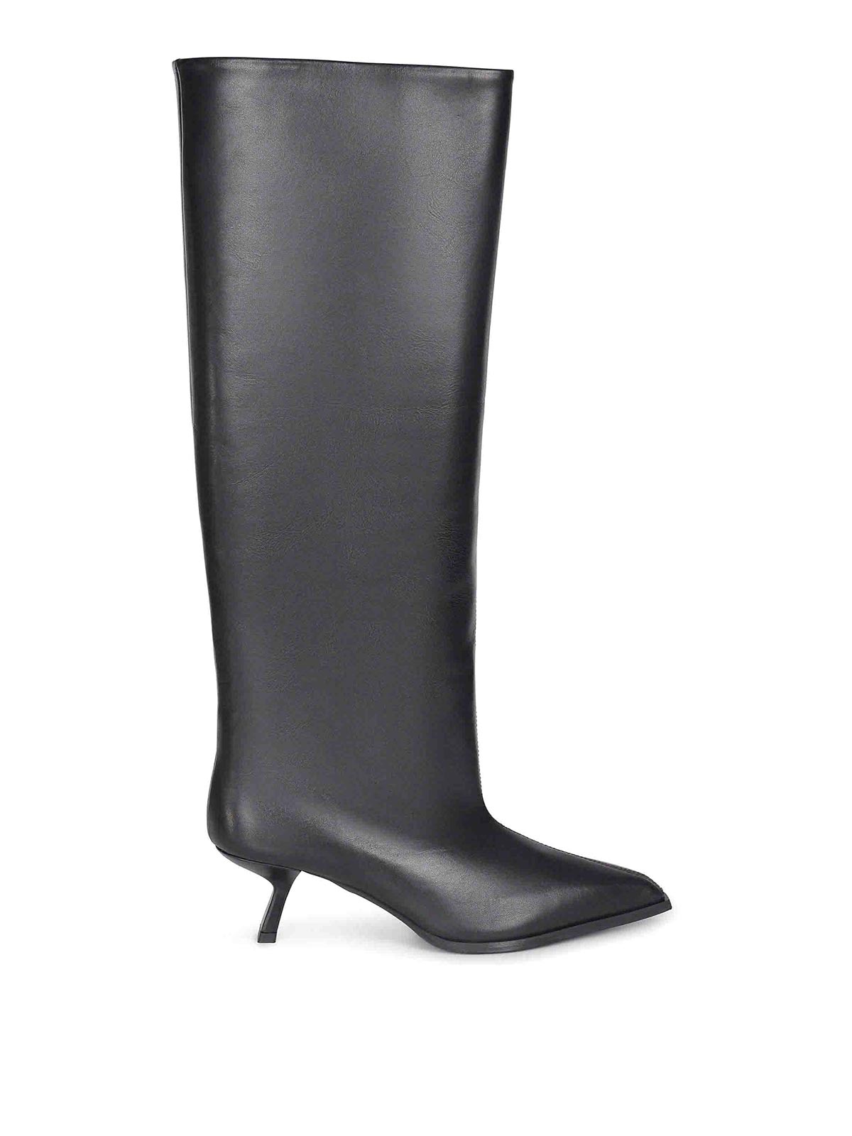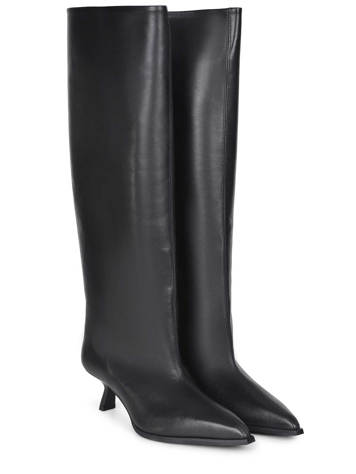Bottes Poeve en cuir noir. tige droite. bout pointu. Hauteur de talon de 50 mm. 100 % cuir. fabriquées en Italie.